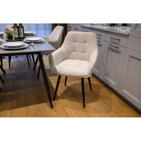 Materiál: látka Vardo 25/kov Oděruodolnost textilie podle testu Martindale: 80 000 oděrů Barva: béžová/černá Rozměry (ŠxHxV): 58,5x62x86 cm Výška sedu: 49 cm Hloubka sedu: 47 cm Šířka sezení: 42,5 cm Výška zádové opěrky: 39 cm Nosnost: 90 kg Designové S měkkou sedací částí Dodáváno v demontu