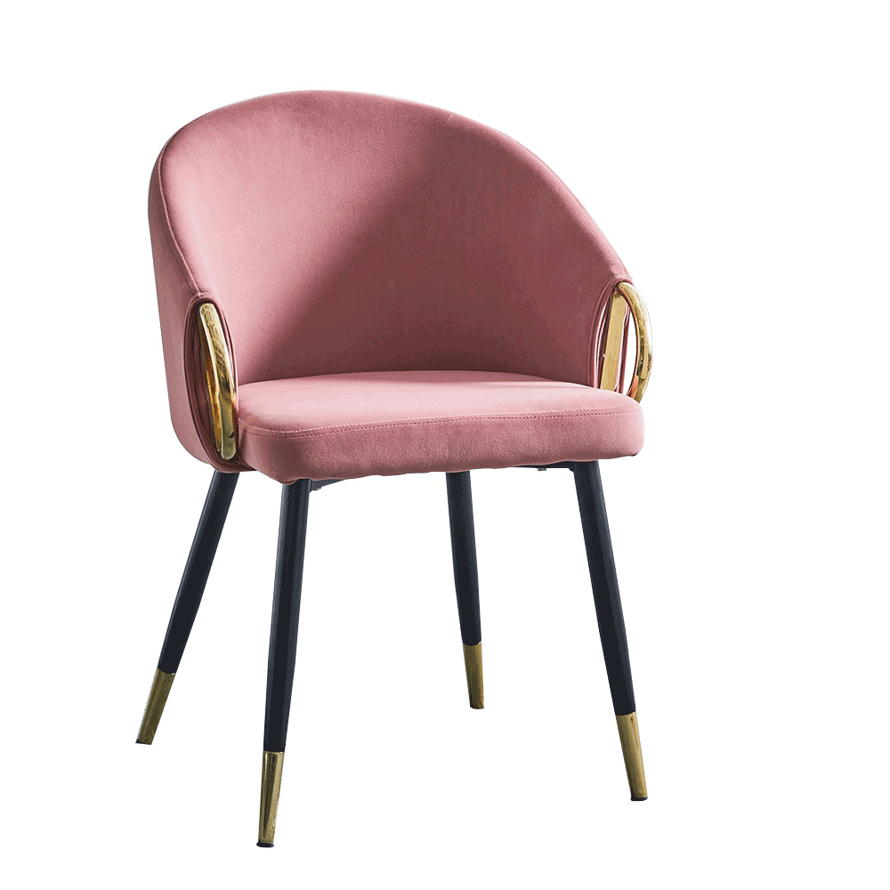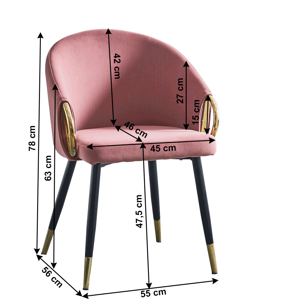 Materiál: velvet látka / černý kov / chrom Oděruodolnost textilie podle testu Martindale: 85 000 oděrek Barva: růžová / černá / gold chrom zlatý Rozměry (ŠxHxV): 55x56x78 cm Hloubka sezení: 46 cm Výška sezení: 47,5 cm Výška opěrky zad: 30,5 cm Šířka sedáku: 45 cm Výška opěrky rukou: 27 cm Výška zlaté části opěrky: 15 cm Výška od země po opěrku: 63 cm Nosnost: 90 kg Designové, luxusní Příruční Elegantní a funkční kovová konstrukce Nohy zakončené ohebnými kluzáky na vyrovnání nerovnosti povrchu Dodávané v demontu