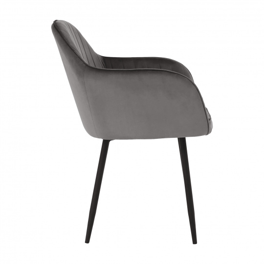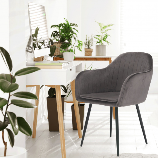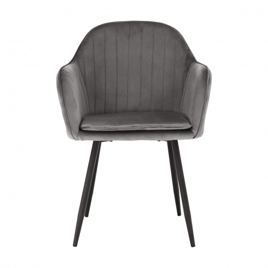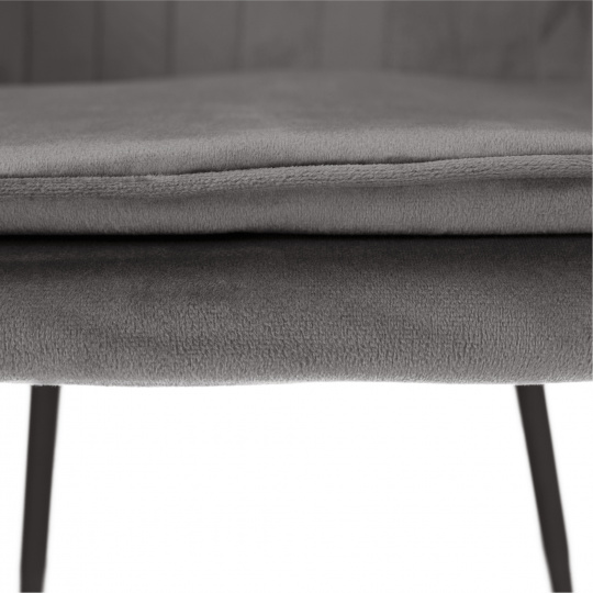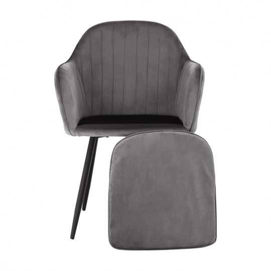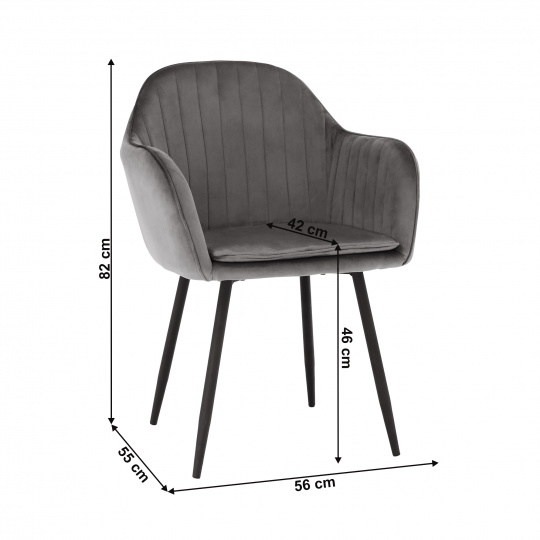 Materiál: látka Velvet / kov Oděruodolnost textilie podle testu Martindale: 80 000 oděrek Barva: šedá / černá Rozměry (ŠxHxV): 56x55x82 cm Výška sedu: 46 cm Hloubka sedu: 42 cm Výška od země po opěrku na ruce: 67 cm Nosnost: 100 kg designové prošívané S měkkou sedací částí Dodávané v demontu.