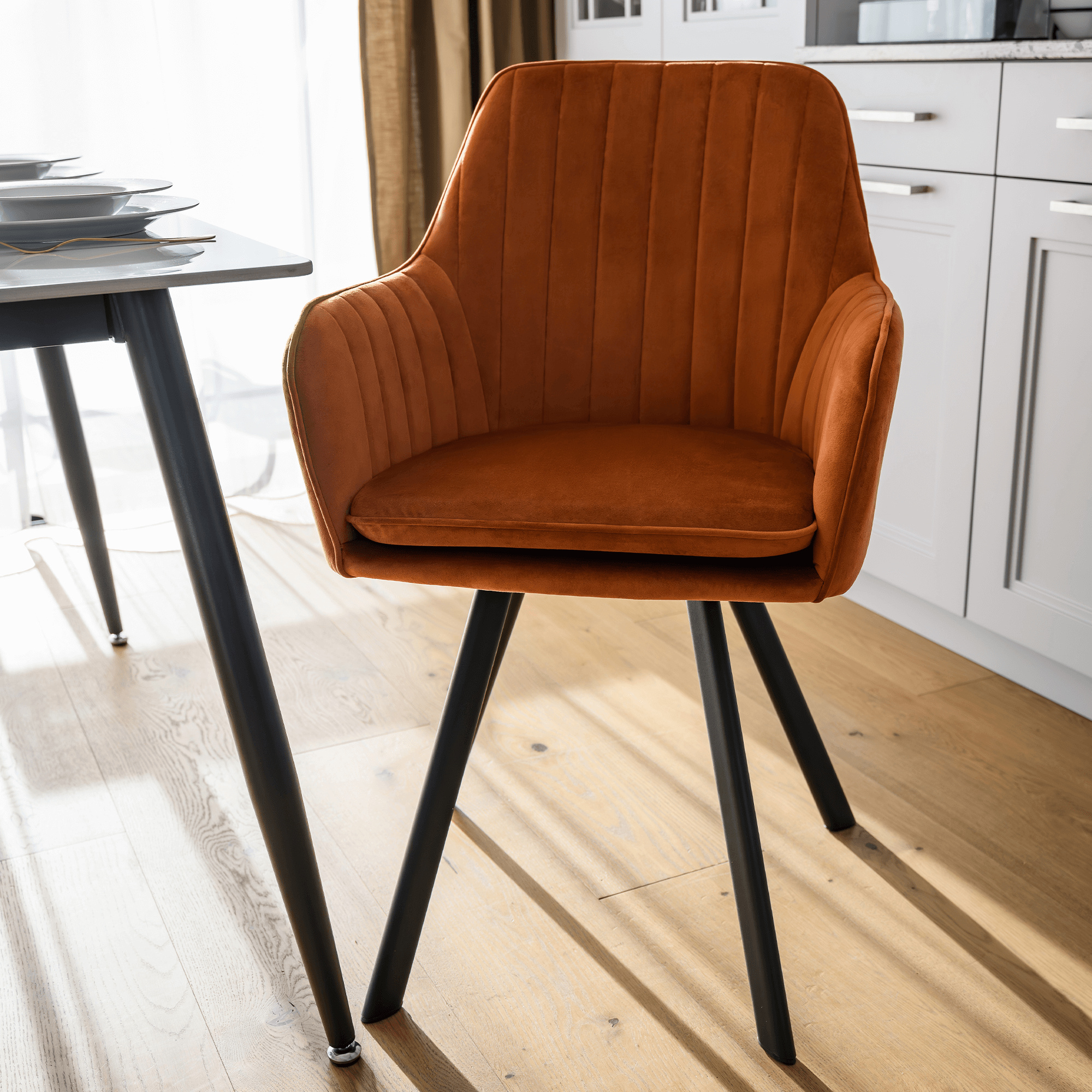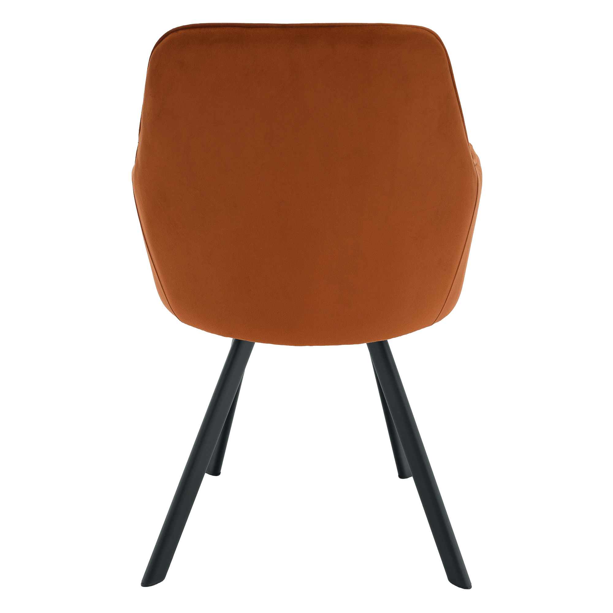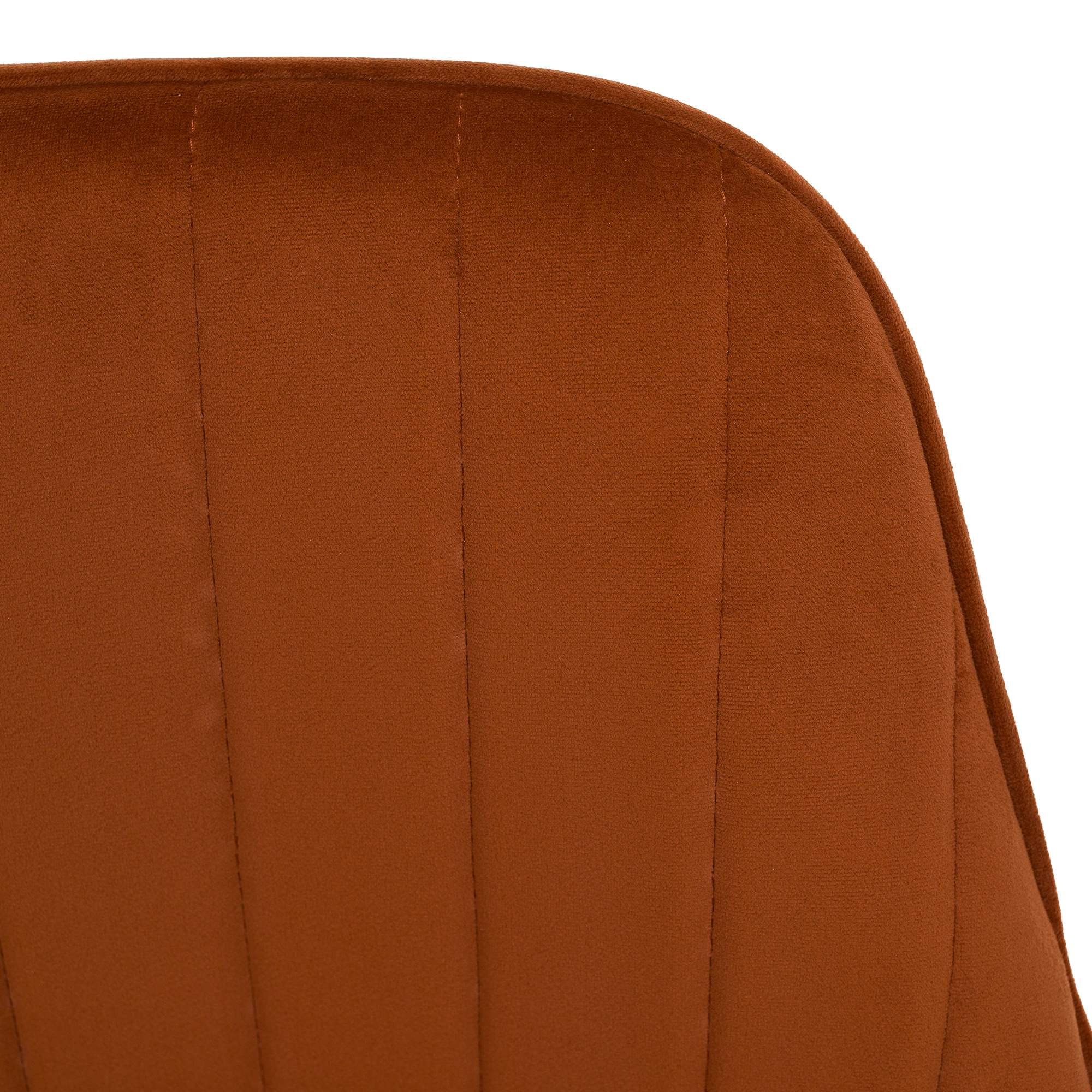 Materiál: látka Bluvel 4215/kov Oděruodolnost textilie podle testu Martindale: 80 000 oděrů Barva: terakota Velvet/černá Rozměry (ŠxHxV): 57x56x87,5 cm Výška sedu: 53 cm Hloubka sedu: 44 cm Šířka sezení: 42 cm Výška zádové opěrky: 40 cm Nosnost: 90 kg Designové Dekorativní prošité opěrky S měkkou sedací částí Dodáváno v demontu