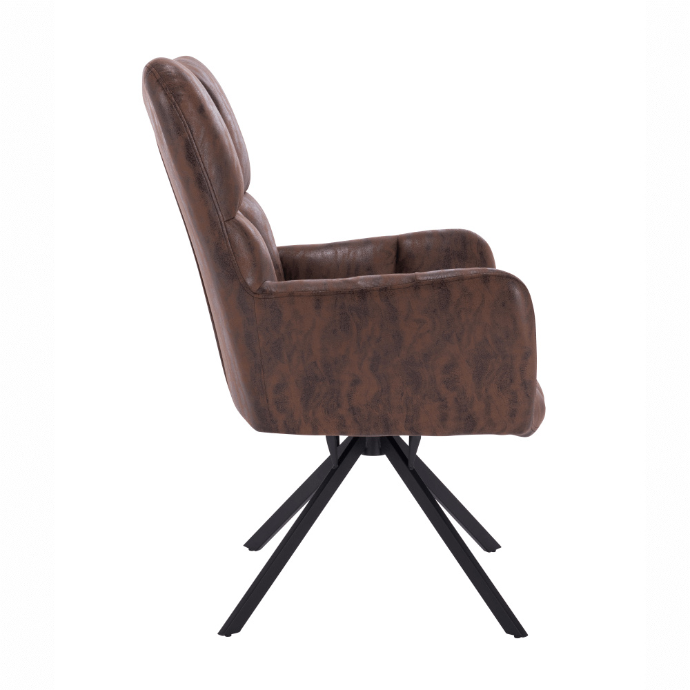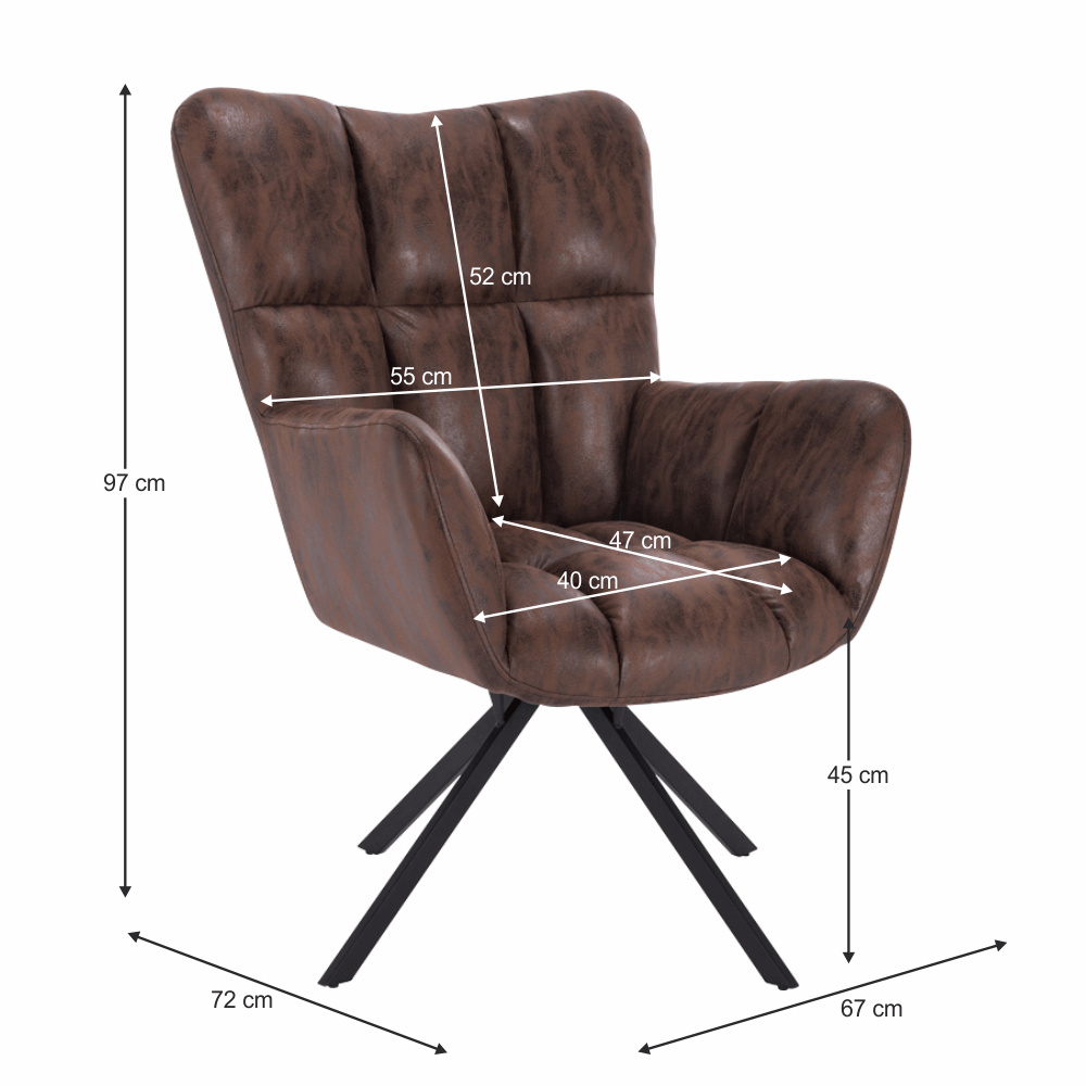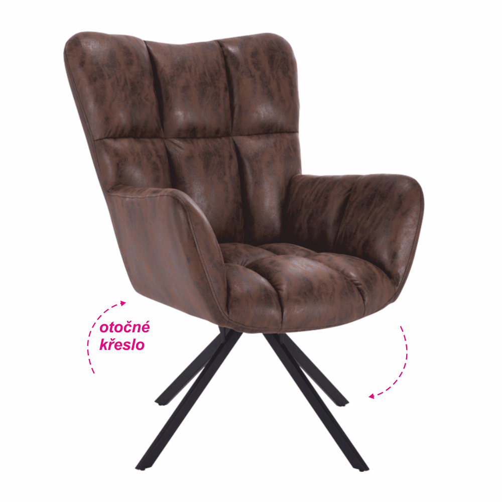 Materiál: látka s efektem broušené kůže / kov Oděruodolnost textilie podle testu Martindale: 68 000 oděrek Barva: hnědá/černá Rozměry (ŠxHxV): 67x72x97 cm Výška sedu: 45 cm Hloubka sedu: 47 cm Šířka sedu: 40 cm Výška zádové opěrky: 52 cm Šířka zádové opěrky: 55 cm Nosnost: 120 kg designové otočné Extra měkké nadýchané čalounění Dodávané v demontu