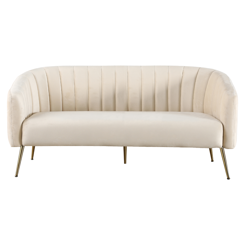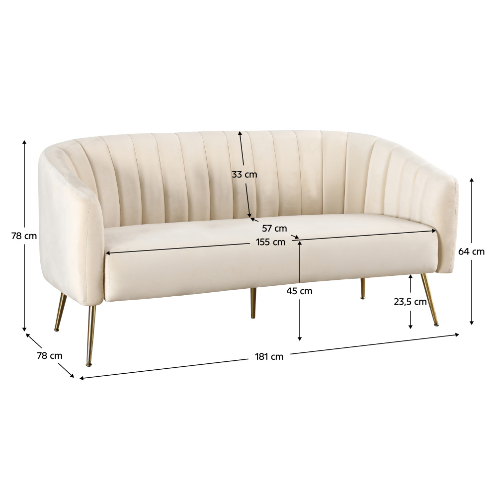 Materiál: Velvet látka/kov Oděruodolnost látky podle testu Martindale: 95 000 oděrů Barva: béžová/gold chrom-zlatý Rozměry (ŠxHxV): 181x78x78 cm Výška sedu: 45 cm Hloubka sedu: 57 cm Šířka sedu: 155 cm Výška zádové opěrky: 33 cm Výška opěrky na ruku od země: 64 cm Výška spodního prostoru od podlahy: 23,5 cm Nosnost na osobu: 90 kg Výplň: pěna Celočalouněné Luxusní Dekorativně prošívané Na nožičkách Dodáváno v demontu