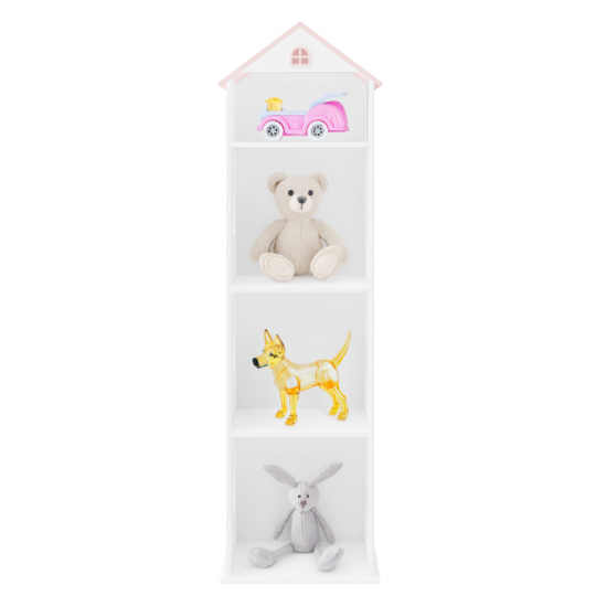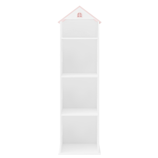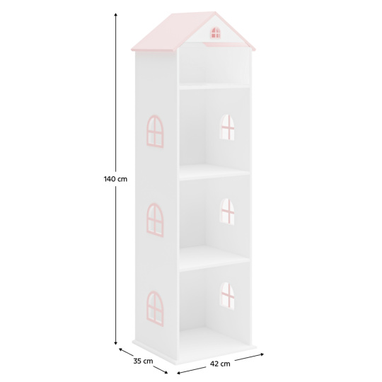 Materiál: MDF Barva: bílá/růžová Rozměry (ŠxHxV): 42x35x140 cm Tloušťka materiálu: 1,2 cm Nosnost police: 10 kg Dětská knihovna Regál Ve tvaru domečku Hravý design Podporuje dětskou fantazii Otevřený úložný prostor Police Praktický Vhodný pro uskladnění knih, hraček nebo jiných drobností Vhodné do dětských pokojů Nevhodné pro děti do 3 let Splňuje bezpečnostní normy EN 71 Doporučujeme připevnit ke zdi Dodáváno v demontu