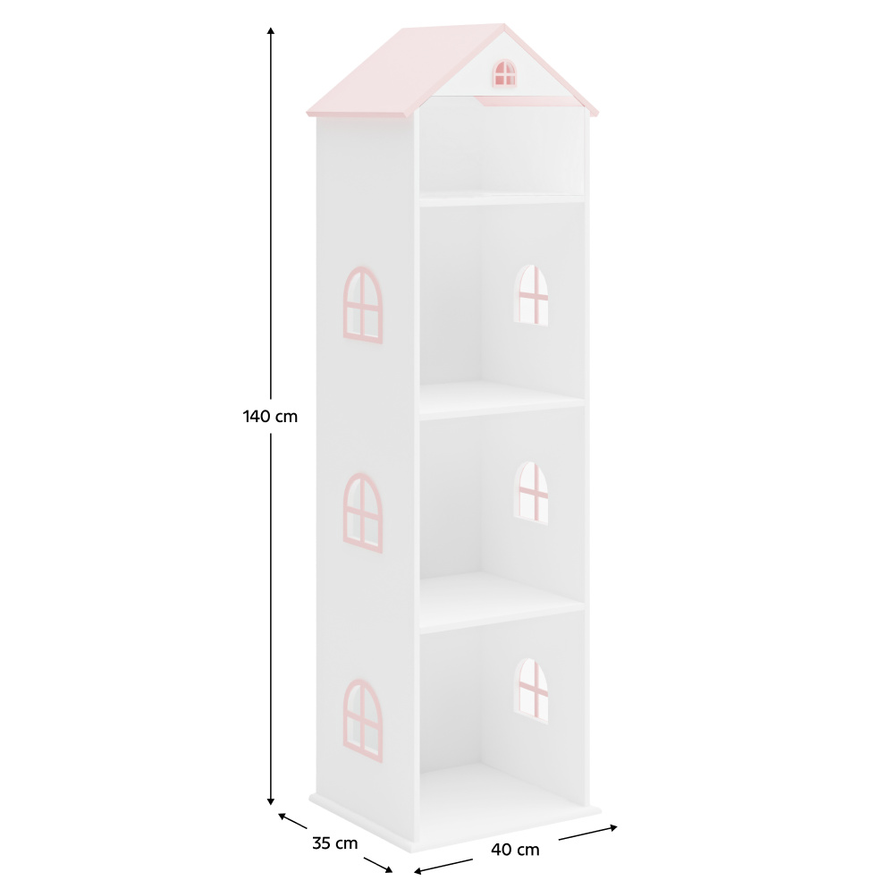 Materiál: MDF Barva: bílá/růžová Rozměry (ŠxHxV): 42x35x140 cm Tloušťka materiálu: 1,2 cm Nosnost police: 10 kg Dětská knihovna Regál Ve tvaru domečku Hravý design Podporuje dětskou fantazii Otevřený úložný prostor Police Praktický Vhodný pro uskladnění knih, hraček nebo jiných drobností Vhodné do dětských pokojů Nevhodné pro děti do 3 let Splňuje bezpečnostní normy EN 71 Doporučujeme připevnit ke zdi Dodáváno v demontu