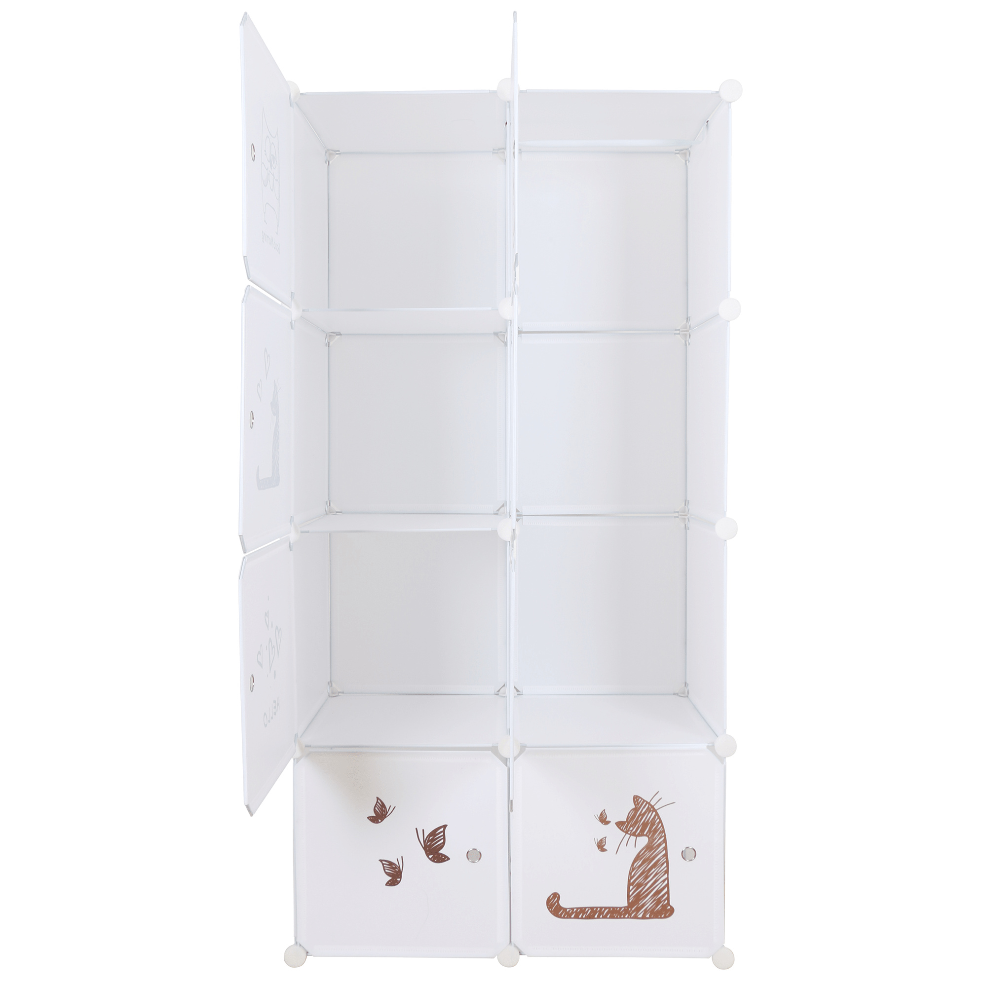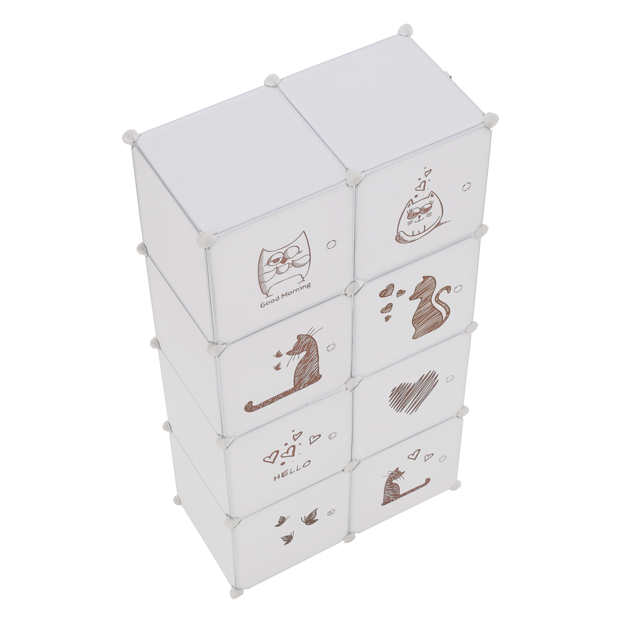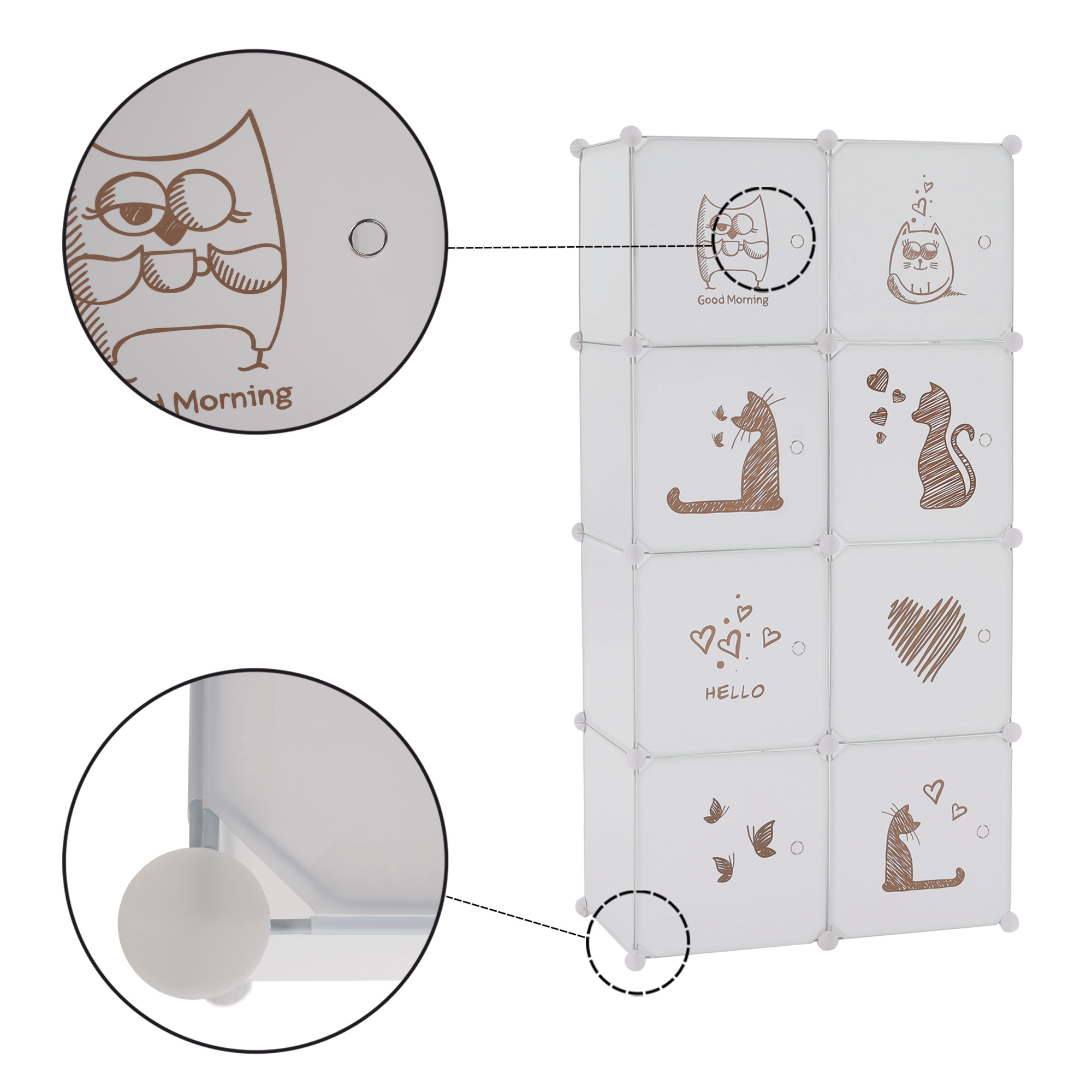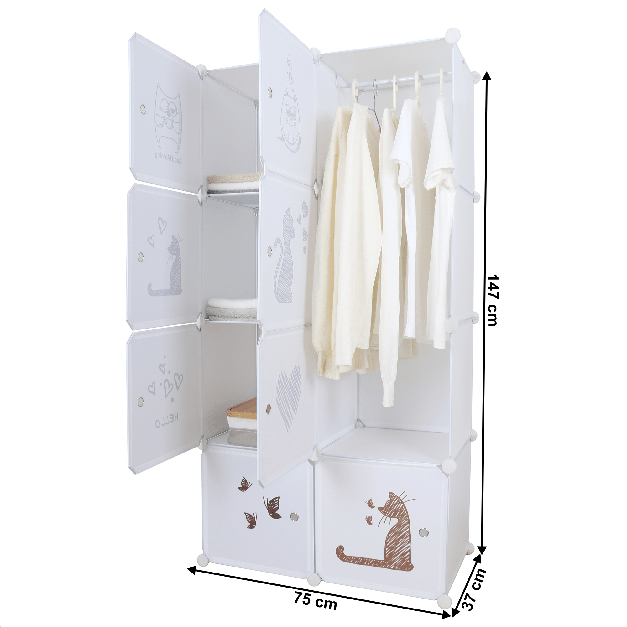 Materiál konstrukce: kov Materiál box: plast Barva: bílá/dětský hnědý vzor Rozměry (ŠxHxV): 75x37x147 cm Spojovací prvky vyrobené z pevného ABS plastu Různé varianty rozmístění polic Nosnost police: 5 kg 8 úložných boxů Součástí balení je závěsná tyč Boxy je třeba rovnoměrně zatěžovat Dětská Se závěsným prostorem kovová konstrukce Snadná údržba Vhodná do dětských pokojů Dodávané v demontu V balení se nachází upevnění ke zdi, které je třeba používat spolu s výrobkem, aby nedošlo k prevráteniu.