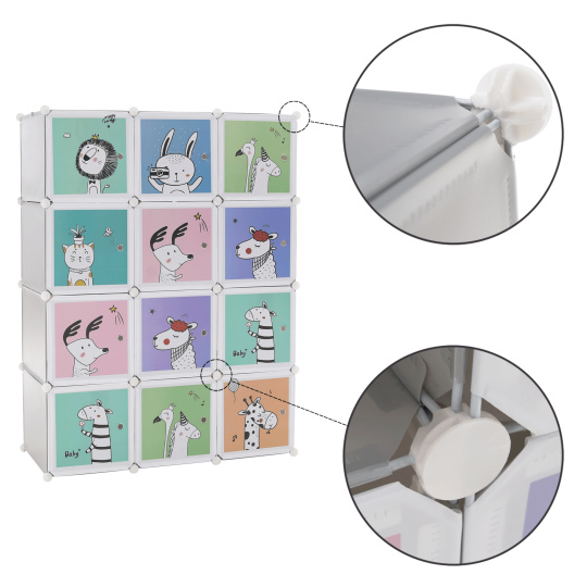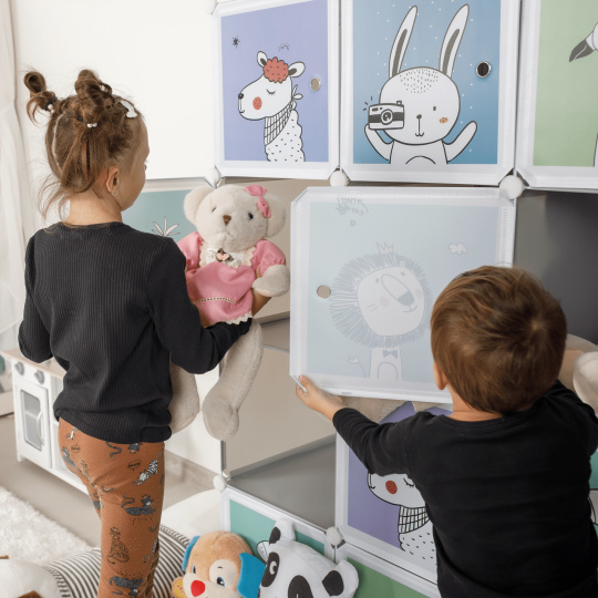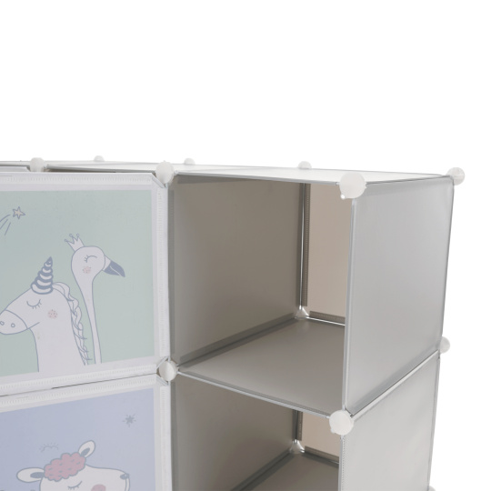 Materiál konstrukce: kov Materiál box: plast Barva: šedá / dětský vzor Rozměry (ŠxHxV): 111x47x147 cm Spojovací prvky vyrobené z pevného ABS plastu Různé varianty rozmístění polic Nosnost boxu: 5 kg Dva boxy s věšákovou tyčí Sedm úložných boxů Boxy je třeba rovnoměrně zatěžovat Vnitřní rozložení skříně si víte přizpůsobit Dětská závěsná kovová konstrukce Vhodná do dětských pokojů Dodávané v demontu V balení se nachází upevnění ke zdi, které je třeba používat spolu s výrobkem, aby nedošlo k převrácení. Výhodou modulárního typu nábytku je to, že si skříň můžete smontovat dle vlastních potřeb. Vnitřní rozložení skříně nemusí být takové jako na obrázku, věšákovou i policovou část si umíte rozvrhnout podle toho, jak právě potřebujete.