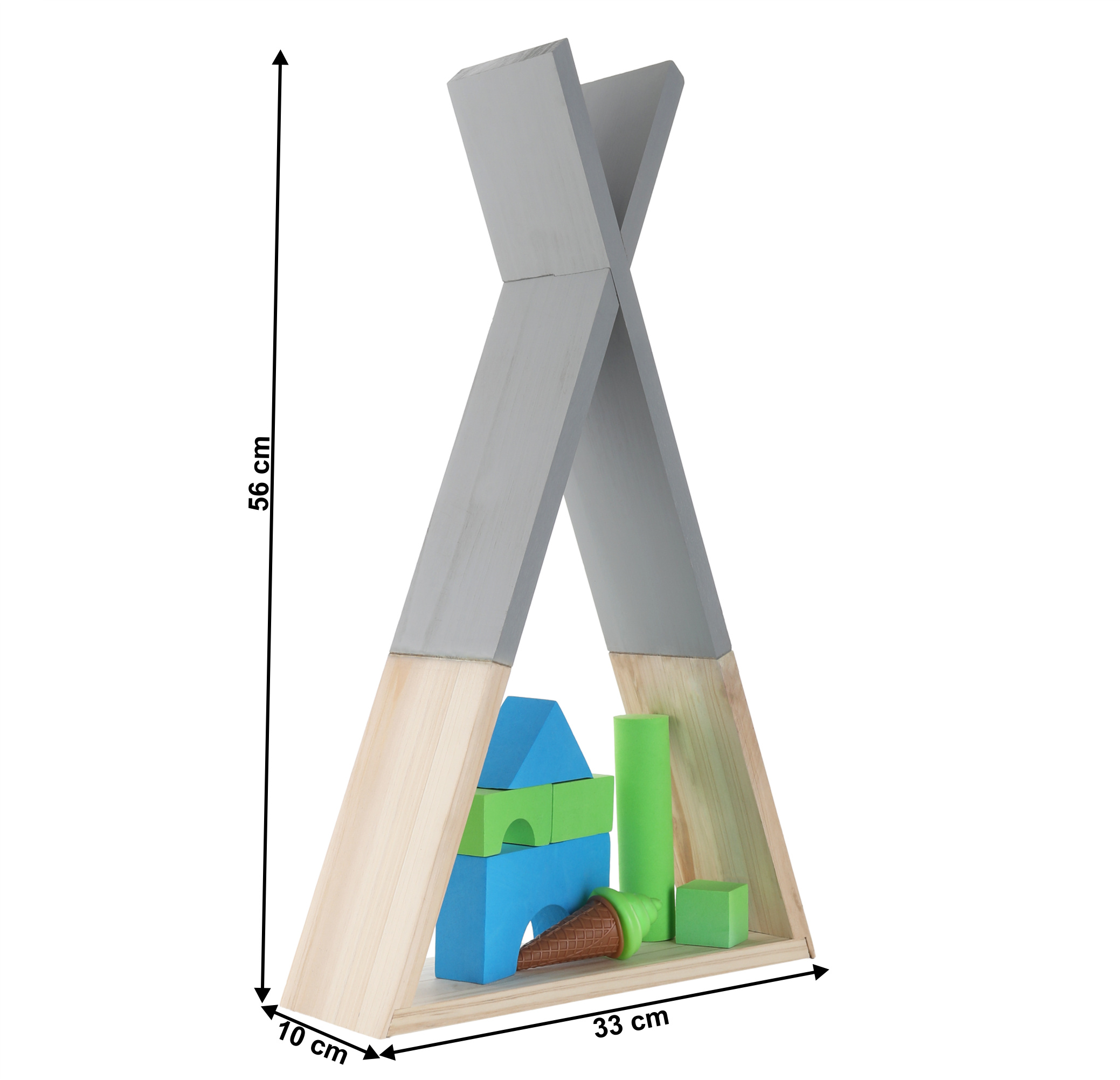 Materiál: masivní dřevo Barva: šedá / přírodní Rozměry (ŠxHxV): 33x10x56 cm Nosnost: 3 kg Dětská Vhodná do dětských pokojů Do školek i kluboven Dodávané v demontu