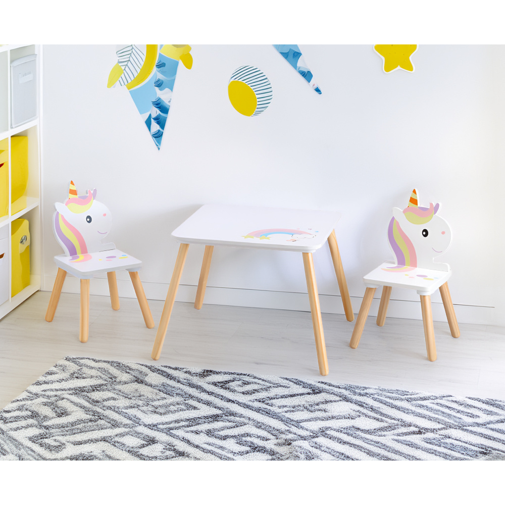 Materiál: MDF/masivní borové dřevo Barva: bílá/přírodní/dětský motiv jednorožec Rozměry stolek (ŠxHxV): 50x50x42,5 cm Nosnost stolku: 50 kg Rozměry židle (ŠxHxV): 24x28x49,5 cm Nosnost židle: 50 kg Výška sedu: 20 cm Tloušťka materiálu: 1,2-1,5 cm Set 1+2 1x stolek 2x židle Kouzelný design Ideální pro kreslení, hraní nebo malé oslavy Vhodný do dětského pokoje, školky i herního koutku Ideální velikost pro děti Zaoblené hrany Použití v interiéru Čistěte jemným navlhčeným hadříkem a následně otřete do sucha Neumisťujte tento výrobek blízko okna, aby jej dítě nevyužilo jako schůdek a nevypadlo Vhodné pro děti od 3 do 7 let Splňuje bezpečnostní normy EN 17191:2021 Dodáváno v demontu