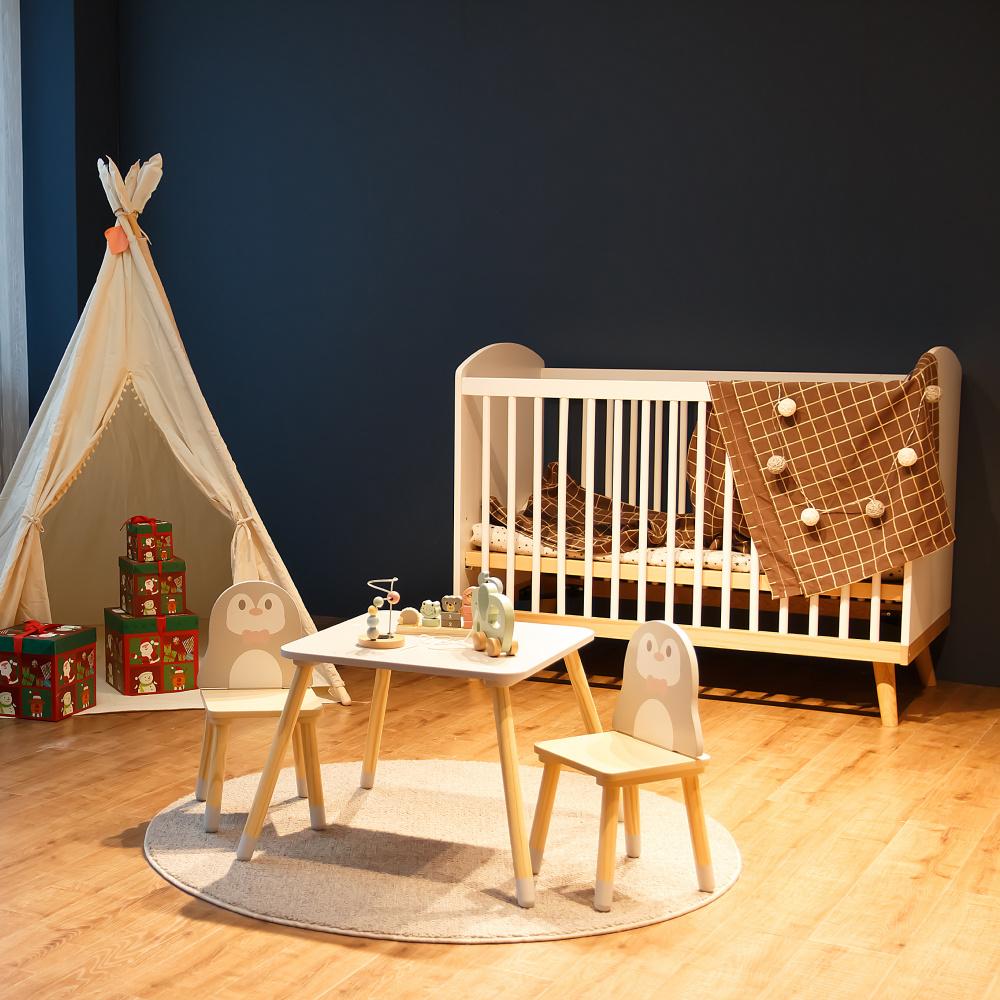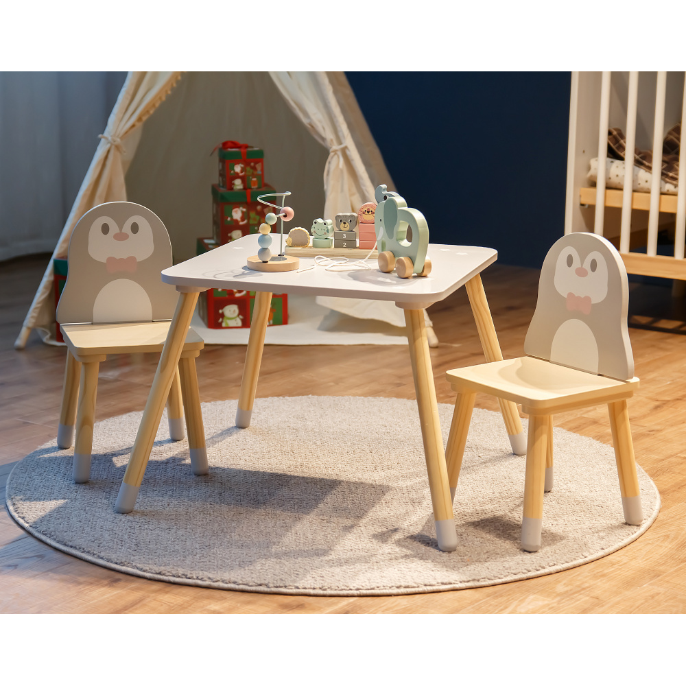 Materiál: MDF/masivní borové dřevo Barva: bílá/šedá/dětský motiv tučňák Rozměry stolek (ŠxHxV): 50x50x42,5 cm Nosnost stolku: 50 kg Rozměry židle (ŠxHxV): 25,5x29x49,5 cm Nosnost židle: 50 kg Výška sedu: 20 cm Tloušťka materiálu: 1,2-1,5 cm Set 1+2 1x stolek 2x židle Kouzelný design Ideální pro kreslení, hraní nebo malé oslavy Vhodný do dětského pokoje, školky i herního koutku Ideální velikost pro děti Zaoblené hrany Použití v interiéru Čistěte jemným navlhčeným hadříkem a následně otřete do sucha Neumisťujte tento výrobek blízko okna, aby jej dítě nevyužilo jako schůdek a nevypadlo Vhodné pro děti od 3 do 7 let Splňuje bezpečnostní normy EN 17191:2021 Dodáváno v demontu