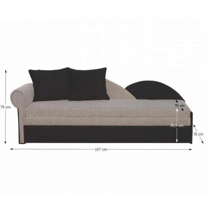 (ŠxHxV): 197x78x75 cm, plocha na spaní (DxŠ): 185x140 cm.