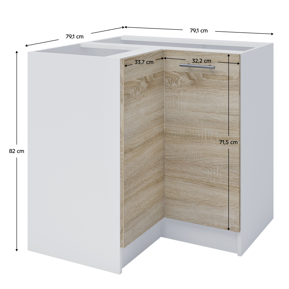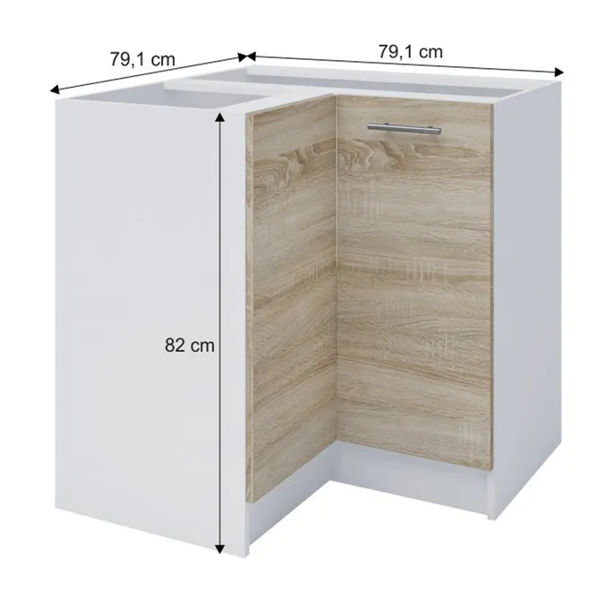 dolní rohová skříňka S - 90N, materiál: DTD laminovaná, barevné provedení: dub sonoma / bílá, korpus: dub sonoma, skříňka bílá. Rozměry ŠxVxH: 79,1x82x79,1 cm. Dodáváno v demontu. Možnost zakoupení pracovní desky Fabiana Metalic brown šedá s tloušťkou 2,8 cm, šířkou 60 cm a cenou za bm 1.390 Kč. Možnost dokoupení univerzálního L / P dřezu LAY ON.