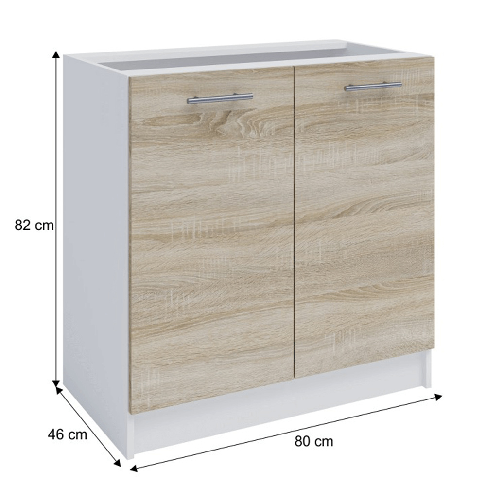 dolní skříňka S - 80, materiál: DTD laminovaná, barevné provedení: dub sonoma / bílá, korpus: bílá, dvířka: dub sonoma. Rozměry ŠxVxH: 80x82x46 cm. Tloušťka materiálu: 16 mm Dodáváno v demontu. Možnost zakoupení pracovní desky Fabiana Metalic brown šedá s tloušťkou 2,8 cm, šířkou 60 cm a cenou za bm 1.450 Kč. Možnost dokoupení univerzálního L / P dřezu LAY ON.
