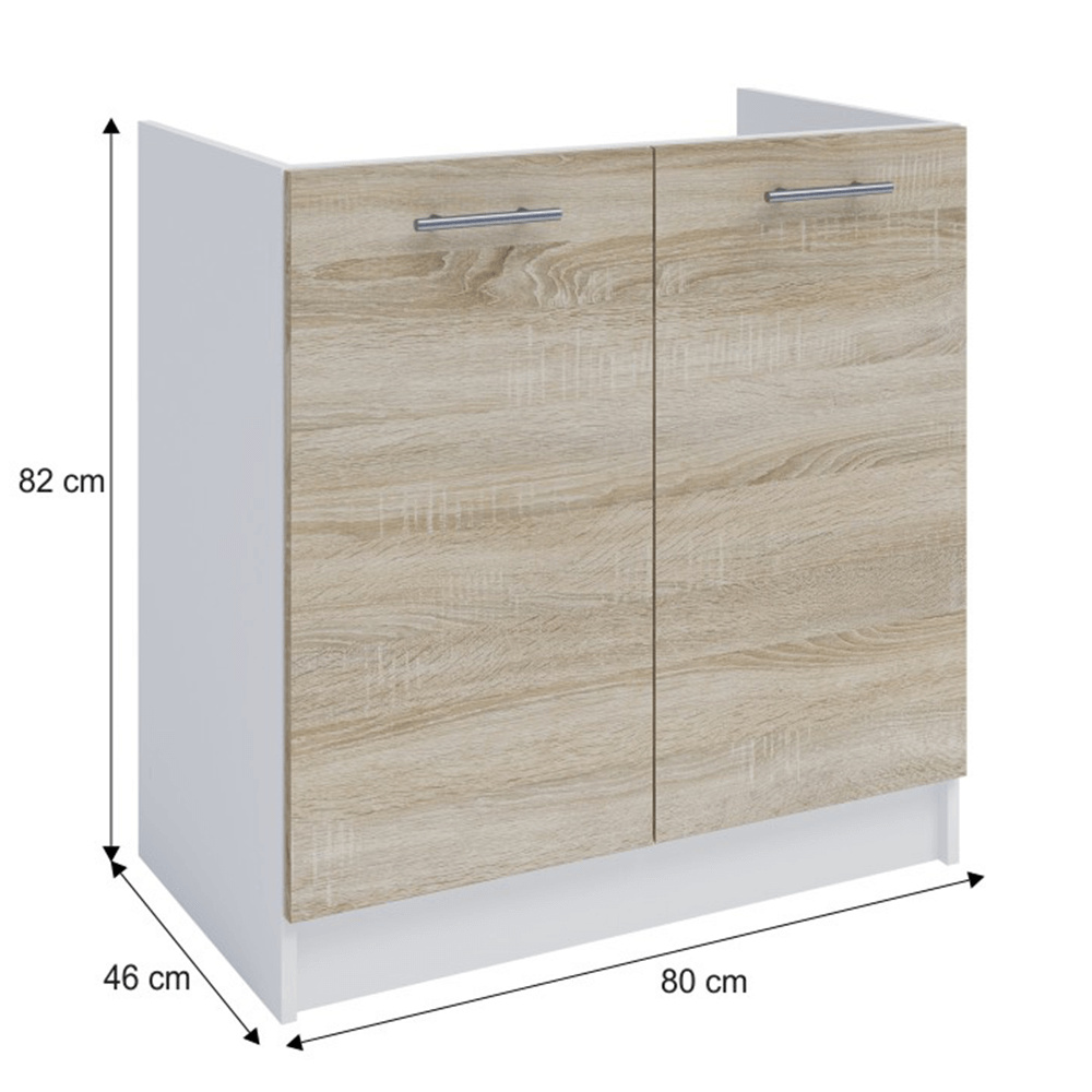 dolní skříňka S - 80ZL, materiál: DTD laminovaná, barevné provedení: dub sonoma / bílá, korpus: bílá, dvířka: dub sonoma. Rozměry ŠxVxH: 80x82x46 cm. Tloušťka materiálu: 16 mm Dodáváno v demontu. Možnost zakoupení pracovní desky Fabiana Metalic brown šedá s tloušťkou 2,8 cm, šířkou 60 cm a cenou za bm 1.450 Kč. Možnost dokoupení univerzálního L / P dřezu LAY ON.