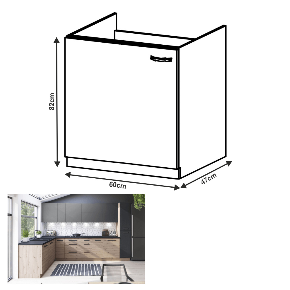 Materiál: DTD laminovaná Barva: dub artisan Rozměry (ŠxHxV): 60x47x82 cm Dřezová Bez dřezu Jednodveřová Tloušťka materiálu dvířka (dub artisan): 1,5 cm Tloušťka materiálu dvířka (šedá MDF): 1,8 cm Univerzální provedení Možnost volby otevírání PUSH OPEN Možnost volby otevírání úchytkami Bez pracovní desky Bez spodní lišty Dodáváno v demontu Cena sektorových skříněk je uváděna bez pracovní desky a spodní lišty. Cena za pracovní desku dub artisan je 1.690 Kč / bm - tloušťka 38 mm, cena za pracovní desku černý vulkán je 1.990 Kč / bm - tloušťka 38 mm. Možnost dokoupení spodní lišty dub artisan v rozměru 1 m za cenu 280 Kč nebo v rozměru 2 m za cenu 560 Kč a ukončení na sokl o hloubce 47 cm nebo 58 cm za 140 Kč. Ke každé dolní skříňce je nutné doobjednat 2 ks úchytů na sokl cena 40 Kč / 2 ks. U skříněk D60S3 a D40S3 je třeba si vybrat skříňku s úchytkou nebo systémem Push Open.