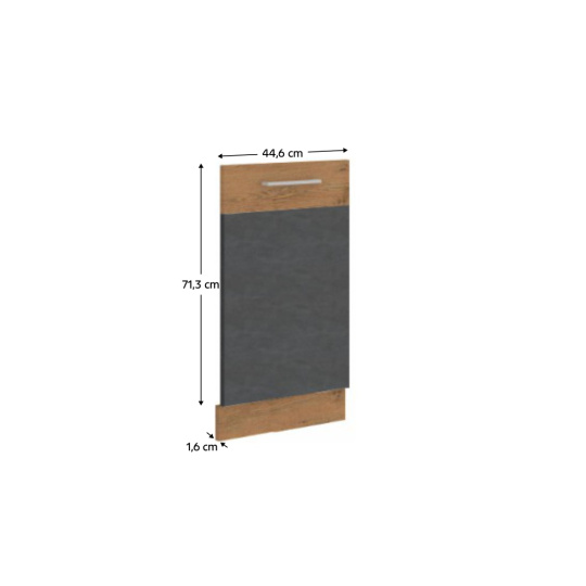 Dvířka na vestavnou myčku VEGA ZM 713x446 Materiál: DTD laminovaná Barva: šedá matná/dub lancelot Rozměry (ŠxHxV): 44,6x1,6x71,3 cm Dodávané v demontu Spodní skříňky jsou dodávány včetně dolní lišty, bez pracovní desky. Možnost dokoupit pracovní desku dub lancelot v ceně: 1590 Kč/bm. Možnost dokoupit univerzální L / P dřez LAY ON.