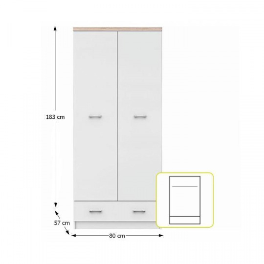 2-dveřová skříň GWEN 70425 Materiál: DTD fóliovaná Provedení: dub sonoma Rozměry (ŠxHxV): 77,6x49,5x200,4 cm Výška od země po věšákovou tyč: 148 cm Tloušťka materiálu: 12 mm věšáková část tři šuplíky Dodávané v demontu Hmotnost: 53.5kg