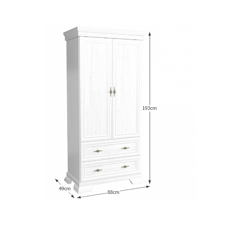 Dvoudveřová skříň KS1 KORA. Barevné provedení sosna andersen. Materiál laminovaná DTD, MDF, kov. Rozměry (ŠxHxV): 88x49x193 cm Tloušťka materiálu korpus: 15 mm Tloušťka materiálu vrchní desky: 22 mm Tloušťka materiálu dolní desky: 22 mm Výška spodního prostoru od podlahy: 10,5 cm