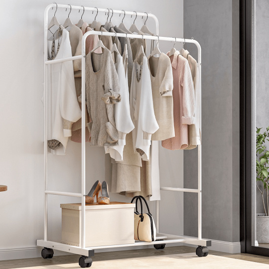 Materiál: kov Barva: bílá Rozměry (ŠxHxV): 80x51x160 cm pevná konstrukce dvě police Dvě věšákové tyče dvouřadý věšák Stojan na oblečení kolečka 2 kolečka s brzdou Nosnost: 30 kg Dodávané v demontu Hmotnost: 3.3kg
