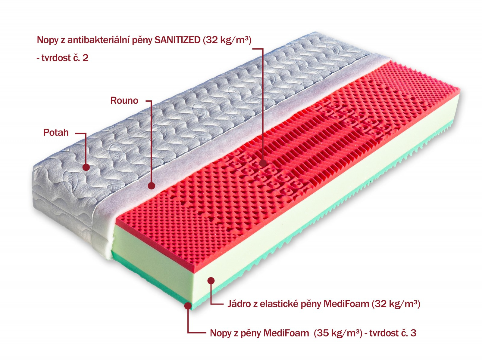 Jádra těchto matrací jsou tvořena pěnou MediFoam (32 kg/m³), která má skvělé podpůrné vlastnosti. Červená ložná plocha je tvořena antibakteriální pěnou tvarovanou do masážních nopů s úpravou Sanitized (32 kg/m³). Jsou vhodné nejen pro alergiky. Jejich druhá strana je tvořena pěnou MediFoam (35 kg/m³), která je taktéž tvarovaná do nopů. Je vhodná pro všechny typy roštů.
