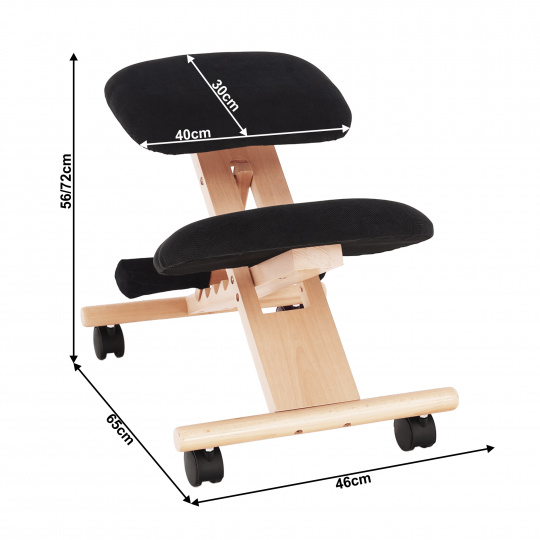 Materiál čalounění: látka Barva: černá Materiál konstrukce: dřevo Barva: buk Rozměry (ŠxHxV): 46x65x56-72 cm Výška sedu: 56-72 cm Hloubka sedu: 30 cm Šířka sedu: 40 cm Nosnost: 100 kg ergonomická Vhodný k PC stolům na kolečkách S opěrkou na nohy Dodávané v demontu