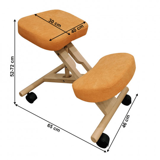 Materiál čalounění: látka Oděruodolnost textilie podle testu Martindale: 80 000 oděrek Barva: oranžová Materiál konstrukce: dřevo Barva: buk Rozměry (ŠxHxV): 46x65x52-72 cm Výška sedu: 52-72 cm Hloubka sedu: 30 cm Šířka sedu: 40 cm Nosnost: 100 kg ergonomická Vhodný k PC stolům na kolečkách Dodávané v demontu
