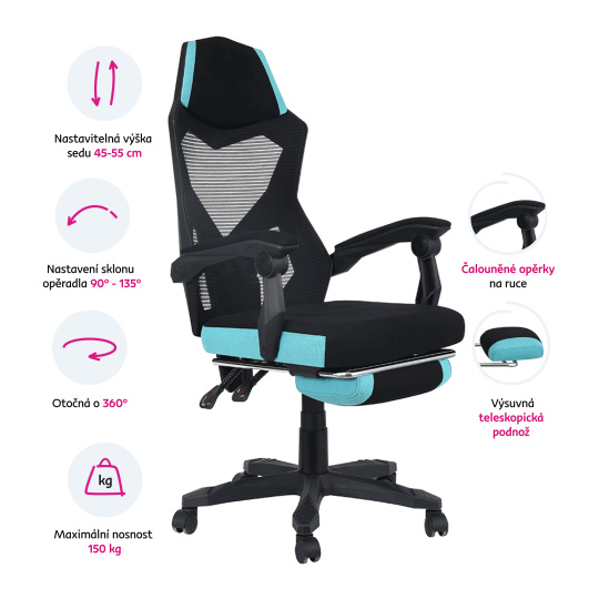 Materiál konstrukce: plast Barva: černá Materiál čalounění: síťovina/látka Oděruodolnost síťoviny podle testu Martindale: 90 000 oděrů Barva: černá/neo mint Rozměry (ŠxHxV): 60x65x108-118 cm Nastavitelná výška sedu: 45-55 cm Hloubka sedu: 49 cm Šířka sedu: 50 cm Výška zádové opěrky: 75,7 cm Šířka zádové opěrky: 48 cm Maximální nosnost: 150 kg Polohovací opěrka zad má sklon 90-135° Určeno pro dlouhé sezení Čalouněné opěrky na ruce Dřevěný nosný rám na sedadle Plastový nosný rám na opěradle Plastová podstava Pogumovaná kolečka Vhodný na dřevěné a plovoucí podlahy Výsuvná podnož Dodáváno v demontu