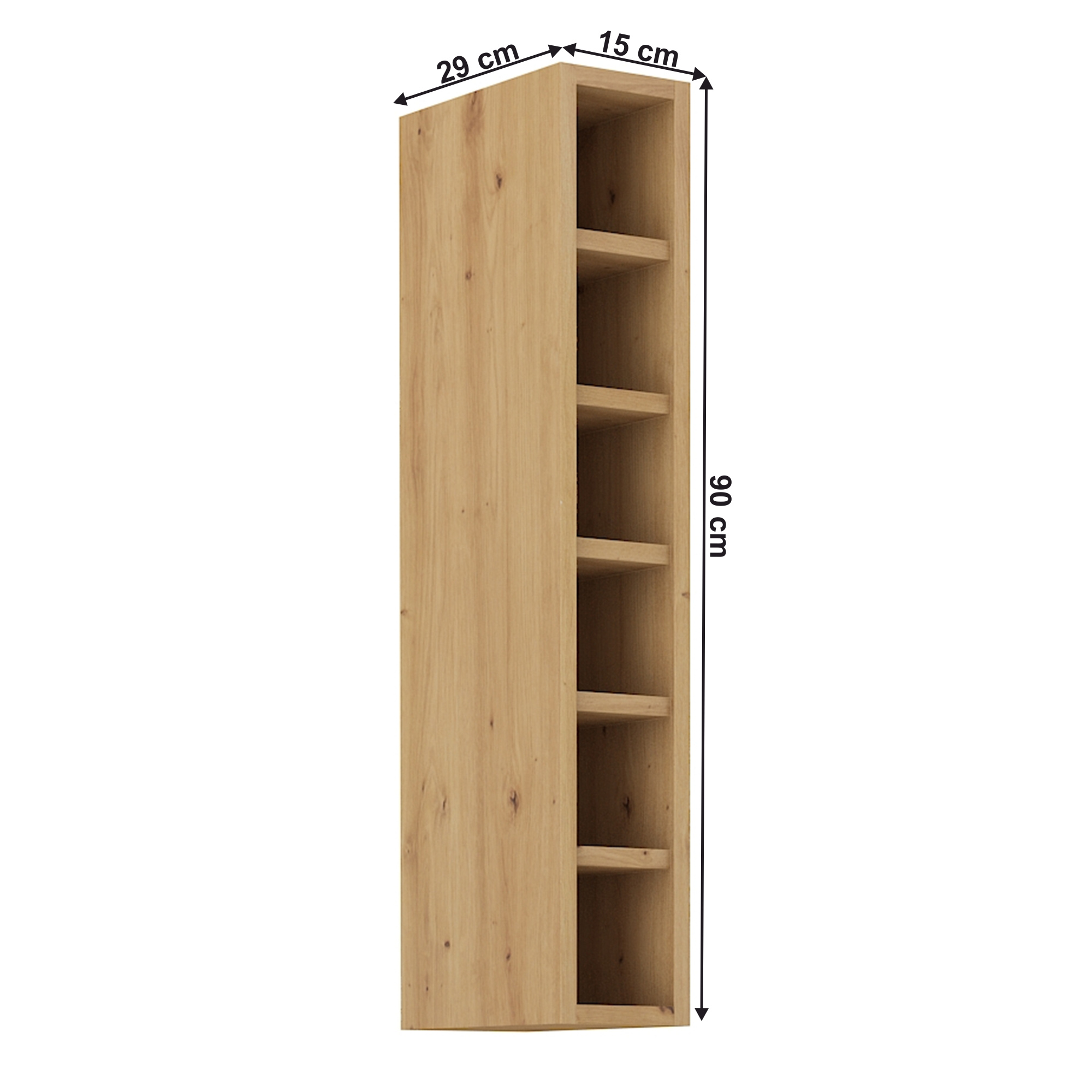 Horní policová skříňka LULA15 G 90 OTW Materiál: DTD laminovaná Barva: dub artisan Rozměry (ŠxHxV): 15x29x90 cm Tloušťka korpusu: 1,6 cm S dolní lištou/soklem S policemi Moderní dynamický design Dodáváno v demontu Možnost dokoupit univerzální dřez LAY ON Spodní skříňky jsou dodávány včetně dolní lišty, bez pracovní desky. Možnost dokoupení pracovní desky dub artisan v ceně 1.890 Kč/bm.nebo marmur roma v ceně 1.790 Kč/bm. Možnost dokoupit univerzální dřez LAY ON.