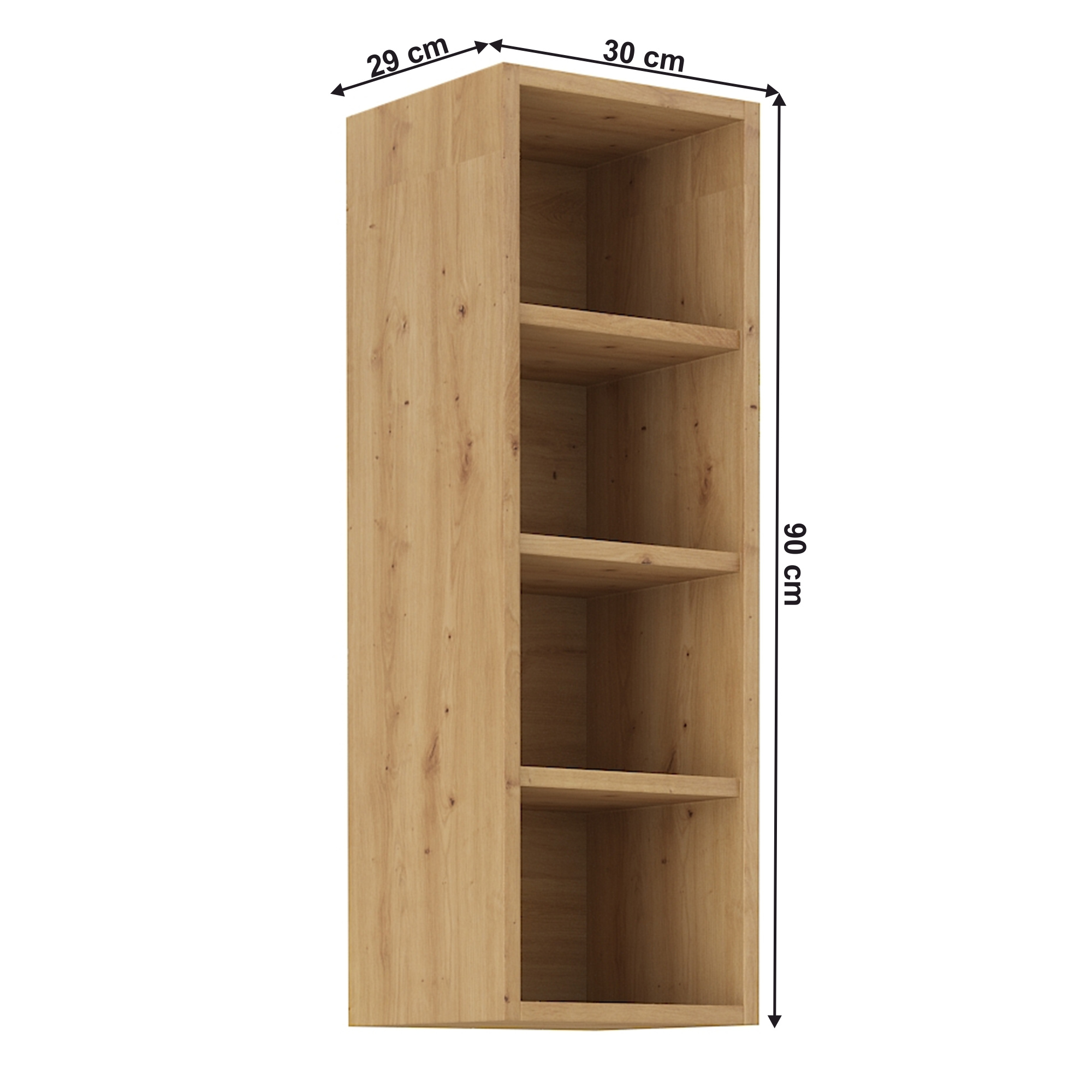 Horní policová skříňka LULA 30 G-90 OTW Materiál: laminovaná DTD Barva: dub artisan Rozměry (ŠxHxV): 30x29x90cm Tloušťka materiálu: 1,6 cm S policemi Otevřená Moderní dynamický design Dodáváno v demontu Možnost dokoupit univerzální dřez LAY ON Spodní skříňky jsou dodávány včetně dolní lišty, bez pracovní desky. Možnost dokoupení pracovní desky dub artisan v ceně 1.890 Kč/bm.nebo marmur roma v ceně 1.790 Kč/bm. Možnost dokoupit univerzální dřez LAY ON.