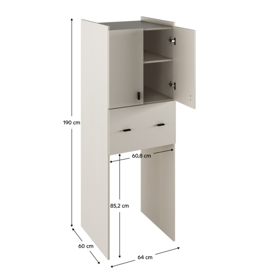 Materiál: DTD laminovaná Barva: kašmír Rozměry (ŠxHxV): 64x60x190 cm Prostor pro pračku (ŠxV): 60,8x85,2 cm S úložným prostorem Skříňka s policemi Šuplík Nosnost šuplíku a polic: 5 kg Tloušťka materiálu korpus: 16 mm Prostor pro pračku Kvalitní slovenský výrobek Dodáváno v demontu