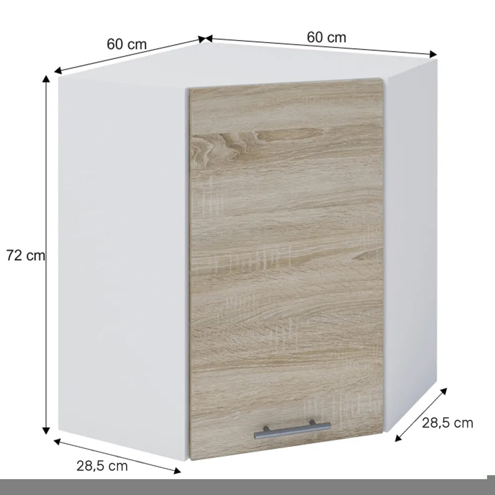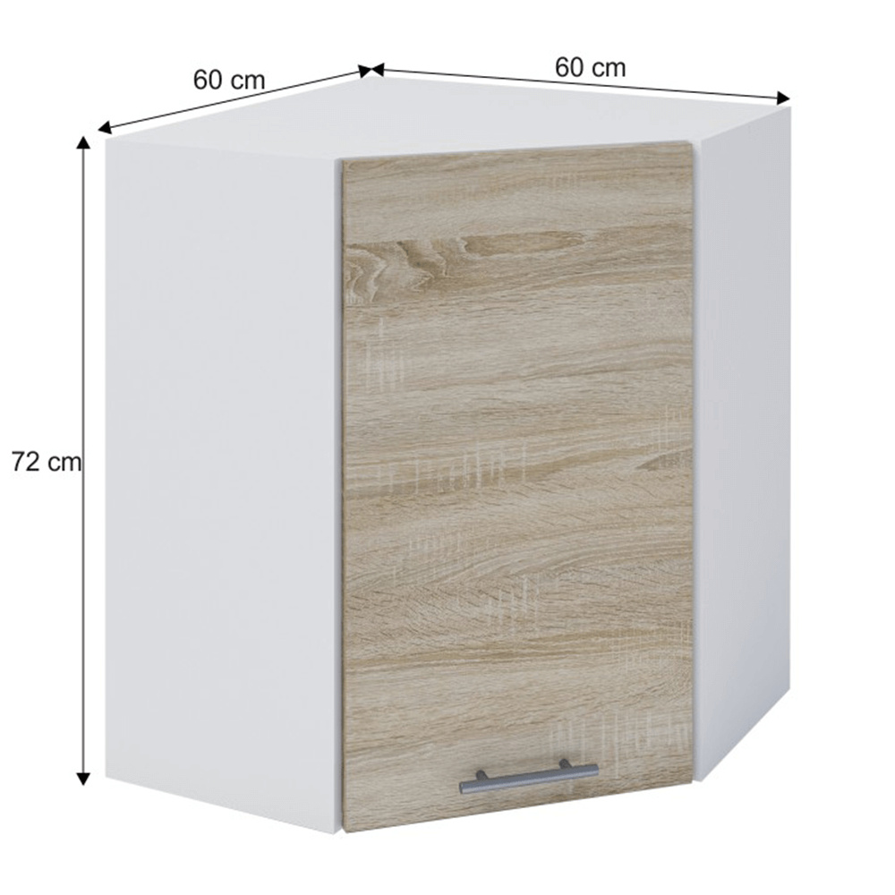 horní rohová skříňka W - 60N, materiál: DTD laminovaná, barevné provedení: dub sonoma / bílá, korpus: bílá, dvířka: dub sonoma. Rozměry ŠxVxH: 60x72x60 cm. Šířka bočních stran: 28,5 cm Tloušťka materiálu: 16 mm Dodáváno v demontu. Možnost zakoupení pracovní desky Fabiana Metalic brown šedá s tloušťkou 2,8 cm, šířkou 60 cm a cenou za bm 1.450 Kč. Možnost dokoupení univerzálního L / P dřezu LAY ON. Horní skříňky se nemontují na lištu, ale věší se na háčky. Háčky do zdi nejsou součástí balení, je třeba si je dokoupit.