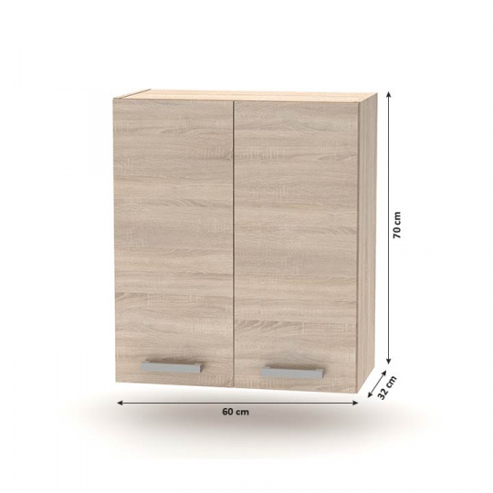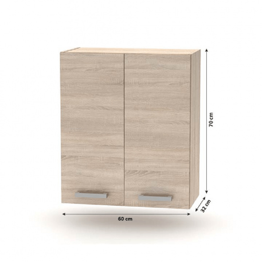 Horní skříňka 2DV, NOPL-007-OH Materiál: DTD laminovaná Barva: dub sonoma Rozměry (ŠxHxV): 60x32x70 cm Tloušťka materiálu: 16 mm Kvalitní slovenský výrobek. Dodávané v demontu. Cena za pracovní desku je 1.590, - Kč za bm - tloušťka 38 mm. Horní rozměr kuchyňské sestavy je 2,4 m, spodní rozměr je 1,8 m. Tloušťka materiálu: 16 mm Základní kuchyňská sestava a všechny spodní skříňky jsou dodávány bez pracovní desky, včetně dolní lišty. Možnost dokoupit univerzální L / P dřez LAY ON.