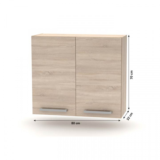 Horní skříňka 2DV, NOPL-014-OH Materiál: DTD laminovaná Barva: dub sonoma Rozměry (ŠxHxV): 80x32x70 cm Tloušťka materiálu: 16 mm Kvalitní slovenský výrobek. Dodávané v demontu. Cena za pracovní desku je 1.590, - Kč za bm - tloušťka 38 mm. Horní rozměr kuchyňské sestavy je 2,4 m, spodní rozměr je 1,8 m. Tloušťka materiálu: 16 mm Základní kuchyňská sestava a všechny spodní skříňky jsou dodávány bez pracovní desky, včetně dolní lišty. Možnost dokoupit univerzální L / P dřez LAY ON.
