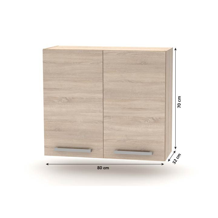 Horní skříňka 2DV, NOPL-014-OH Materiál: DTD laminovaná Barva: dub sonoma Rozměry (ŠxHxV): 80x32x70 cm Tloušťka materiálu: 16 mm Kvalitní slovenský výrobek. Dodávané v demontu. Cena za pracovní desku je 1.590, - Kč za bm - tloušťka 38 mm. Horní rozměr kuchyňské sestavy je 2,4 m, spodní rozměr je 1,8 m. Tloušťka materiálu: 16 mm Základní kuchyňská sestava a všechny spodní skříňky jsou dodávány bez pracovní desky, včetně dolní lišty. Možnost dokoupit univerzální L / P dřez LAY ON.