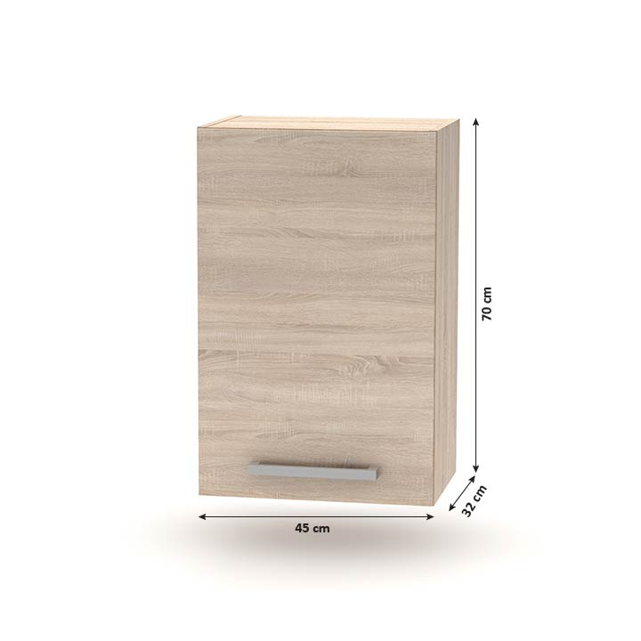 Horní skříňka 45 1DV, NOPL-024-OH Materiál: DTD laminovaná Barva: dub sonoma Rozměry (ŠxHxV): 45x32x70 cm Tloušťka materiálu: 16 mm Kvalitní slovenský výrobek. Dodávané v demontu. Cena za pracovní desku je 1.590, - Kč za bm - tloušťka 38 mm. Horní rozměr kuchyňské sestavy je 2,4 m, spodní rozměr je 1,8 m. Tloušťka materiálu: 16 mm Základní kuchyňská sestava a všechny spodní skříňky jsou dodávány bez pracovní desky, včetně dolní lišty. Možnost dokoupit univerzální L / P dřez LAY ON.