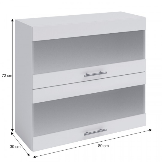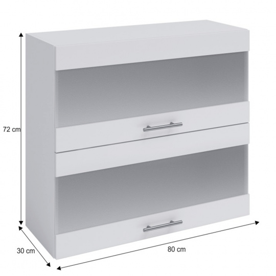 horní skříňka W - 80K2S, materiál: DTD laminovaná, barevné provedení: bílá, rozměry ŠxVxH: 80x72x30 cm. Tloušťka materiálu: 16 mm Dodáváno v demontu. Možnost zakoupení pracovní desky Fabiana Metalic brown šedá s tloušťkou 2,8 cm, šířkou 60 cm a cenou za bm 1.390 Kč. Možnost dokoupení univerzálního L / P dřezu LAY ON. Horní skříňky se nemontují na lištu, ale věší se na háčky. Háčky do zdi nejsou součástí balení, je třeba si je dokoupit.