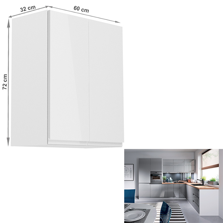 Horní skříňka, Aurora G60K Provedení: DTD laminovaná / MDF Barva: bílá / šedá lakovaná extra vysoký lesk Rozměry (ŠxHxV): 60x32x40 cm Tloušťka materiálu: 15 mm Systém tichého zavírání dvířek Pracovní deska není součástí skříněk. Je možné si doobjednat pracovní desku v provedení dub artisan o tloušťce 38 mm za 1.690 Kč/bm. Možnost dokoupit