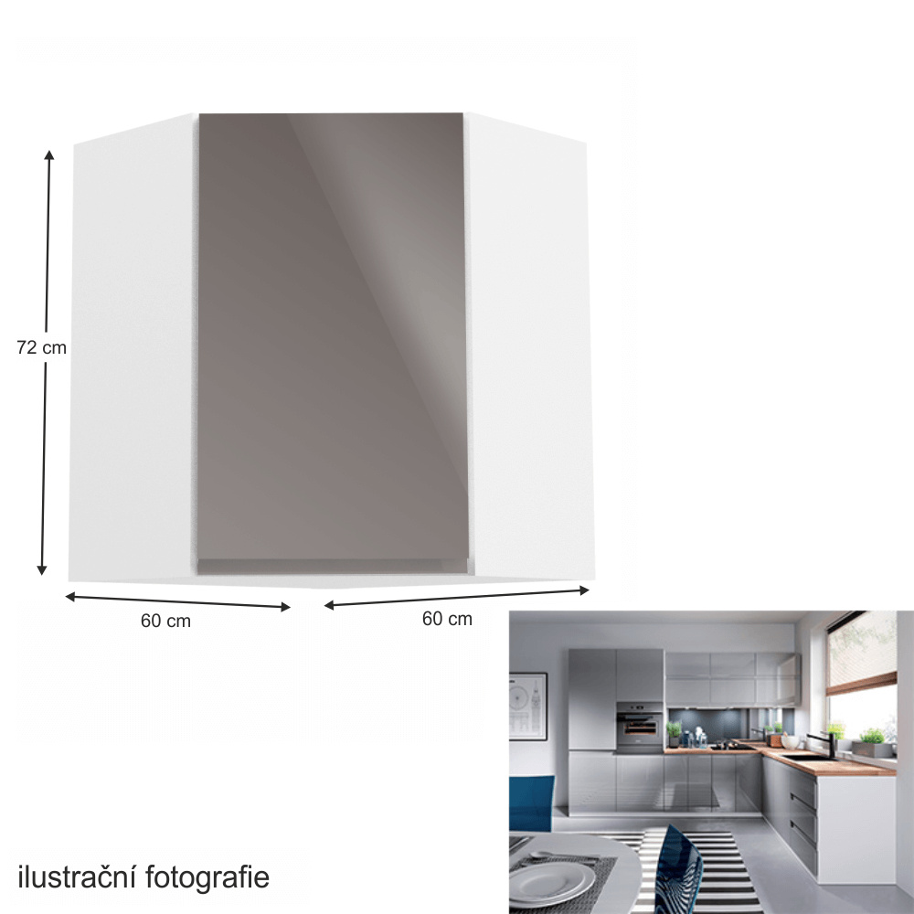Horní skříňka, Aurora G60N Provedení: DTD laminovaná / MDF Barva: bílá / šedá lakovaná extra vysoký lesk Rozměry (ŠxHxV): 60x60x72 cm Tloušťka materiálu: 15 mm Pracovní deska není součástí skříněk. Je možné si doobjednat pracovní desku v provedení dub artisan o tloušťce 38 mm za 1.890 Kč/bm. Možnost dokoupit dřez, dřezovou baterii a příslušenství. Ke spodním skříňkám máte možnost dokoupit spodní lištu/sokl v bílé barvě o rozměru 1 bm za 280 Kč nebo 2 bm za 560 Kč a ukončení na sokl o hloubce 47 cm nebo 58 cm za 210 Kč. Ke každé dolní skříňce, kromě D25PZ, je třeba doobjednat 2 ks úchytek na sokl - cena 40 Kč/2ks.