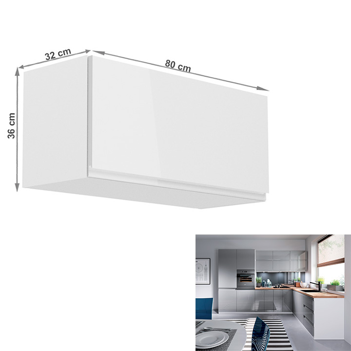 Horní skříňka, Aurora G80K Provedení: DTD laminové / MDF Barva: bílá / bílá lakovaná extra vysoký lesk Rozměry (ŠxHxV): 80x32x36 cm Tloušťka materiálu: 15 mm Systém tichého zavírání dvířek Pracovní deska není součástí skříněk. Je možné si doobjednat pracovní desku v provedení dub artisan o tloušťce 38 mm za 1.690 Kč/bm. Možnost dokoupit d