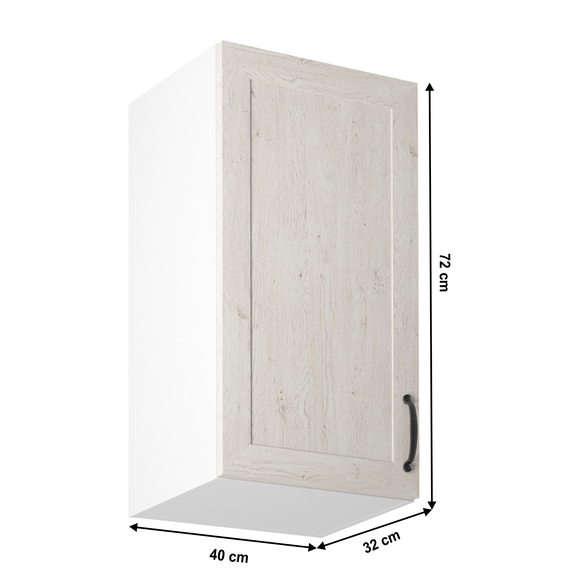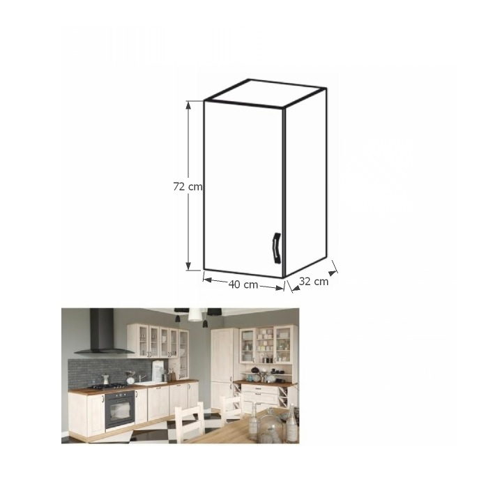 Horní skříňka s dvířky, ROYAL G40, levá Materiál: korpus je vyroben z kvalitní laminované dřevotřísky / kovová úchytka Barva: bílá / dvířka v provedení sosna skandinávská Rozměry ŠxHxV: 40x32x72 cm Tloušťka materiálu: 15 mm Systém tichého zavírání dvířek Dodávané v demontu. Spodní skříňky ke kuchyni ROYAL jsou dodávány bez pracovní desky a bez soklu. Pracovní desku Dub Porterhouse tmavý lze doobjednat v tloušťce 3,8 cm v ceně 1690 Kč/1 bm. Ke každé dolní skříňce, kromě rohových skříněk D25PZ, je třeba doobjednat i sokel v provedení dub divoký v ceně 270 Kč/1 bm a 2 kusy úchytů na sokl v ceně 30 Kč/2 ks. Ke spodním skříňkám máte možnost dokoupit také ukončení na sokl o hloubce 47 cm a 56 cm za 210 Kč. Objednávku vepište do poznámky v objednávkovém formuláři.