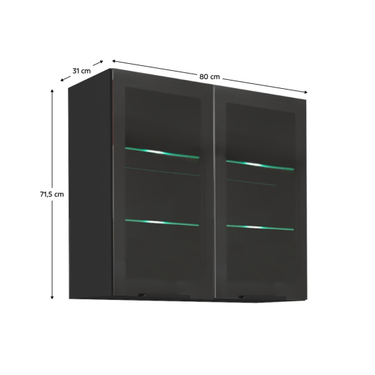 Materiál: laminovaná DTD/sklo Farba: čierny mat Rozmery (ŠxHxV): 80x31x71,5 cm Hrúbka materiálu: 1,6 cm Dvojdverová So sklom Systém tichého zatvárania dvierok S úchytkou Farba úchytky: alumíniová Moderný dizajn Bez LED osvetlenia Možnosť dokúpenia LED osvetlenia Dodávané v demonte Spodní sektorové skříňky jsou dodávány včetně dolní lišty (sokla), bez pracovní desky. Pracovní desku o tloušťce 3,8 cm si můžete doobjednat v provedení marmur roma za cenu 1.650 Kč/bm.