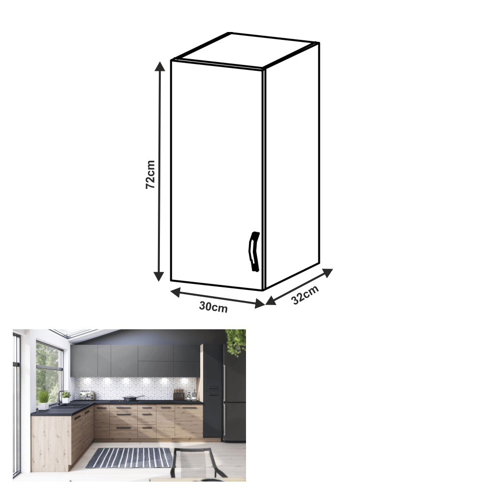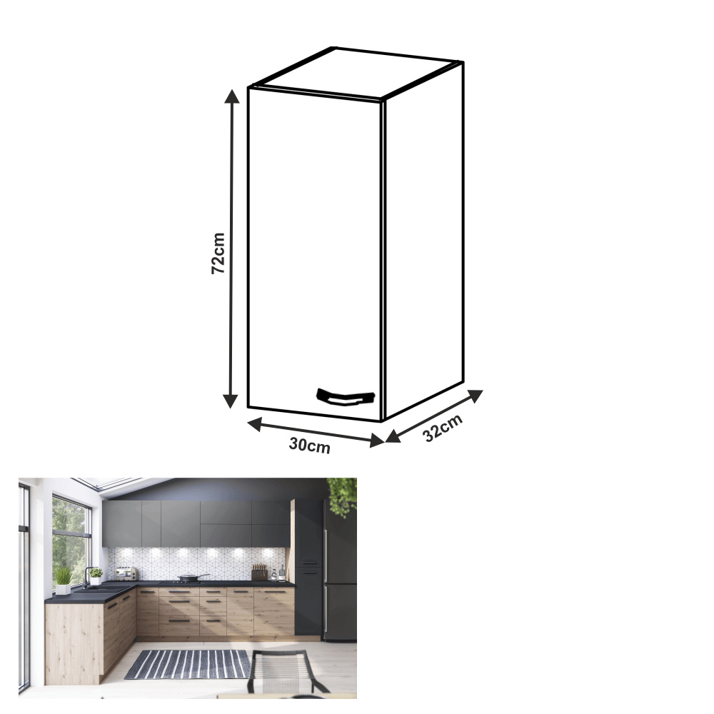Materiál: DTD laminovaná Barva: dub artisan Rozměry (ŠxHxV): 30x32x72 cm Tloušťka materiálu dvířka (dub artisan): 1,5 cm Tloušťka materiálu dvířka (šedá MDF): 1,8 cm S policí S dvířky Univerzální provedení Možnost volby otevírání dvířek systémem PUSH OPEN Možnost volby otevírání dvířek úchytkami Dodáváno v demontu Cena sektorových skříněk je uváděna bez pracovní desky a spodní lišty. Cena za pracovní desku dub artisan je 1.690 Kč / bm - tloušťka 38 mm, cena za pracovní desku černý vulkán je 1.990 Kč / bm - tloušťka 38 mm. Možnost dokoupení spodní lišty dub artisan v rozměru 1 m za cenu 280 Kč nebo v rozměru 2 m za cenu 560 Kč a ukončení na sokl o hloubce 47 cm nebo 58 cm za 140 Kč. Ke každé dolní skříňce je nutné doobjednat 2 ks úchytů na sokl cena 40 Kč / 2 ks. U skříněk D60S3 a D40S3 je třeba si vybrat skříňku s úchytkou nebo systémem Push Open.