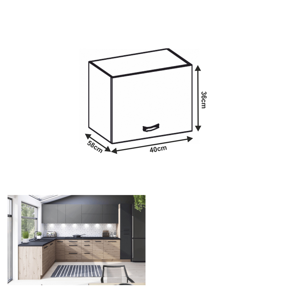 Materiál: DTD laminovaná Barva: dub artisan / šedý mat Rozměry (ŠxHxV): 40x58x36 cm Tloušťka materiálu dvířka (dub artisan): 1,5 cm Tloušťka materiálu dvířka (šedá MDF): 1,8 cm S dvířky výklopná Barva vnitřní strany: bílá Dodávané v demontu Cena sektorových skříněk je uváděna bez pracovní desky a spodní lišty. Cena za pracovní desku dub artisan je 1.690 Kč / bm - tloušťka 38 mm, cena za pracovní desku černý vulkán je 1.990 Kč / bm - tloušťka 38 mm. Možnost dokoupení spodní lišty dub artisan v rozměru 1 m za cenu 280 Kč nebo v rozměru 2 m za cenu 560 Kč a ukončení na sokl o hloubce 47 cm nebo 58 cm za 140 Kč. Ke každé dolní skříňce je nutné doobjednat 2 ks úchytů na sokl cena 40 Kč / 2 ks. U skříněk D60S3 a D40S3 je třeba si vybrat skříňku s úchytkou nebo systémem Push Open.