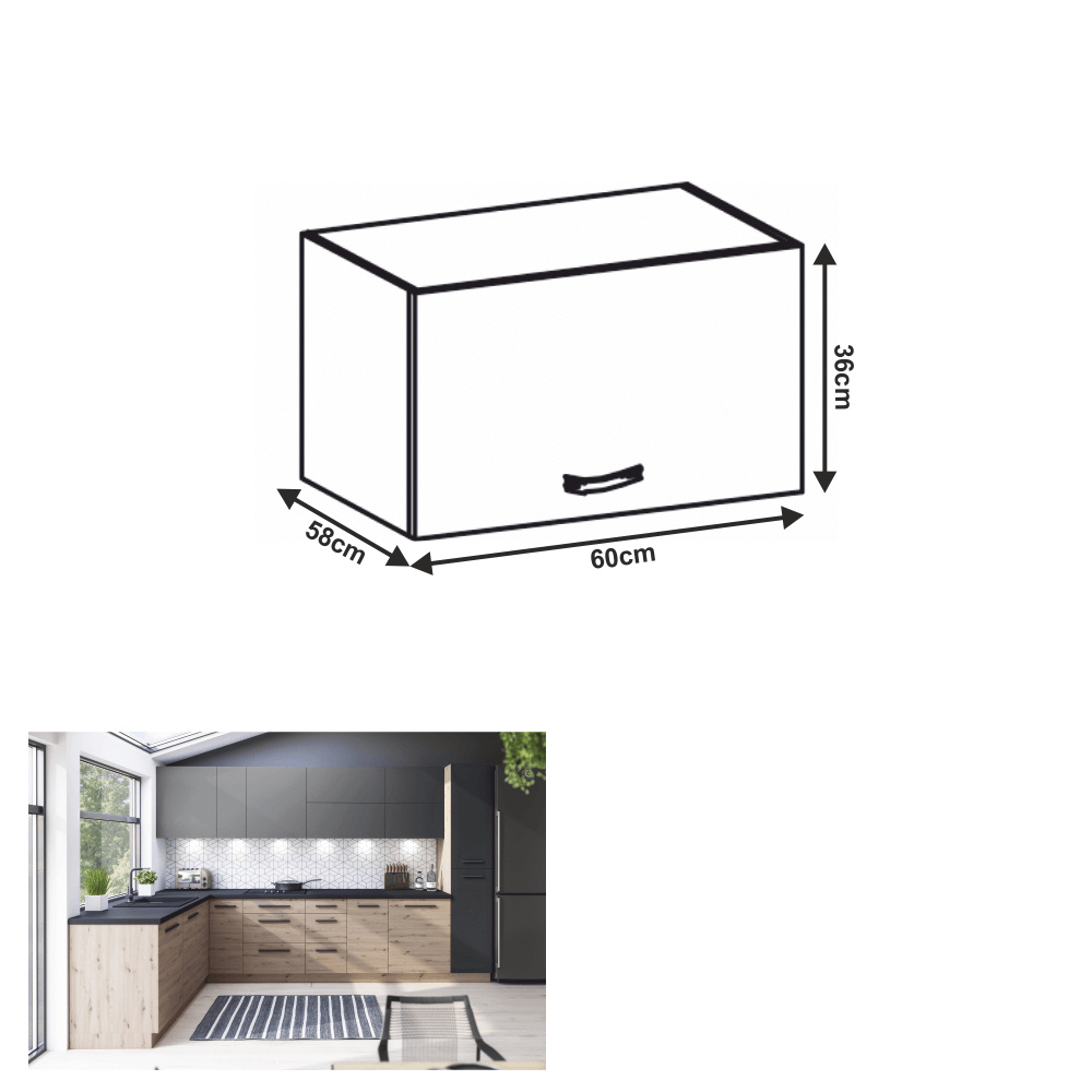 Materiál: DTD laminovaná Barva: dub artisan / šedý mat Rozměry (ŠxHxV): 60x58x36 cm Tloušťka materiálu dvířka (dub artisan): 1,5 cm Tloušťka materiálu dvířka (šedá MDF): 1,8 cm S dvířky výklopná Barva vnitřní strany: bílá Dodávané v demontu Cena sektorových skříněk je uváděna bez pracovní desky a spodní lišty. Cena za pracovní desku dub artisan je 1.690 Kč / bm - tloušťka 38 mm, cena za pracovní desku černý vulkán je 1.990 Kč / bm - tloušťka 38 mm. Možnost dokoupení spodní lišty dub artisan v rozměru 1 m za cenu 280 Kč nebo v rozměru 2 m za cenu 560 Kč a ukončení na sokl o hloubce 47 cm nebo 58 cm za 140 Kč. Ke každé dolní skříňce je nutné doobjednat 2 ks úchytů na sokl cena 40 Kč / 2 ks. U skříněk D60S3 a D40S3 je třeba si vybrat skříňku s úchytkou nebo systémem Push Open.