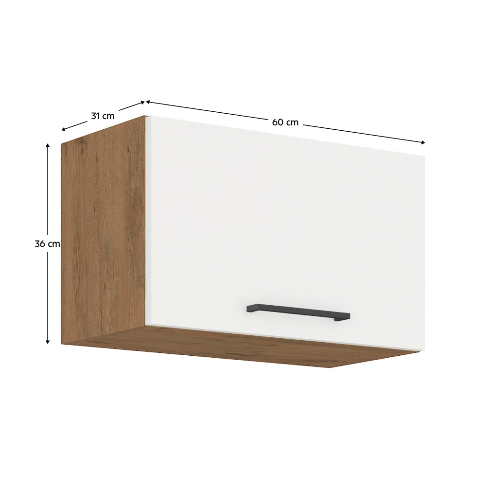 Horní skříňka VEGA 60 GU-36 1F Materiál: DTD laminovaná Barva: dub lancelot / bílá extra vysoký lesk HG Rozměry (ŠxHxV): 60x31x36 cm Dodávané v demontu Spodní skříňky jsou dodávány včetně dolní lišty, bez pracovní desky. Možnost dokoupit pracovní desku dub lancelot v ceně: 1590 Kč/bm. Možnost dokoupit univerzální L / P dřez LAY ON.