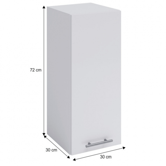horní skříňka W - 30, materiál: DTD laminovaná, barevné provedení: bílá Rozměry ŠxVxH: 30x72x30 cm. Dodáváno v demontu. Možnost zakoupení pracovní desky Fabiana Metalic brown šedá s tloušťkou 2,8 cm, šířkou 60 cm a cenou za bm 1.390 Kč. Možnost dokoupení univerzálního L / P dřezu v ceně 2.190,- Kč Horní skříňky se nemontují na lištu, ale věší se na háčky. Háčky do zdi nejsou součástí balení, je třeba si je dokoupit.
