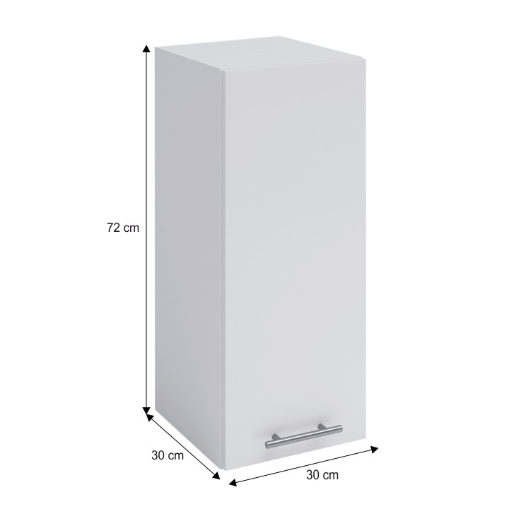 horní skříňka W - 30, materiál: DTD laminovaná, barevné provedení: bílá Rozměry ŠxVxH: 30x72x30 cm. Dodáváno v demontu. Možnost zakoupení pracovní desky Fabiana Metalic brown šedá s tloušťkou 2,8 cm, šířkou 60 cm a cenou za bm 1.390 Kč. Možnost dokoupení univerzálního L / P dřezu v ceně 2.190,- Kč Horní skříňky se nemontují na lištu, ale věší se na háčky. Háčky do zdi nejsou součástí balení, je třeba si je dokoupit.