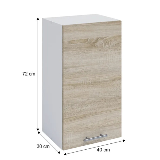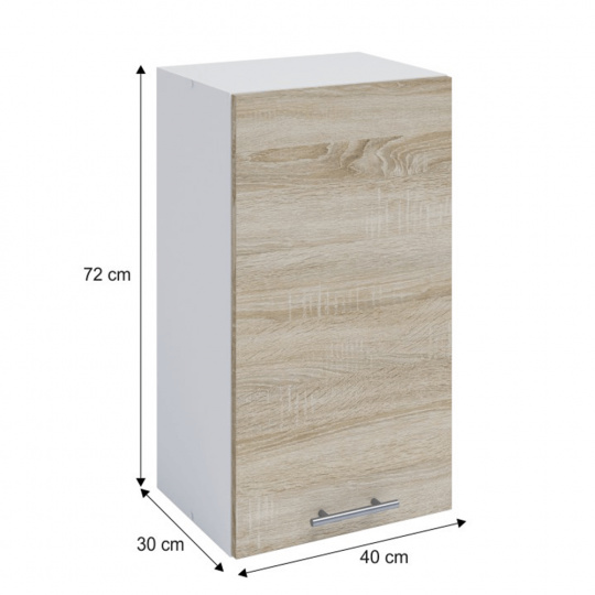 horní skříňka W - 40, materiál: DTD laminovaná, barevné provedení: dub sonoma / bílá, korpus: bílá, dvířka: dub sonoma. Rozměry ŠxVxH: 40x72x30 cm. Dodáváno v demontu. Možnost zakoupení pracovní desky Fabiana Metalic brown šedá s tloušťkou 2,8 cm, šířkou 60 cm a cenou za bm 1.390 Kč. Možnost dokoupení univerzálního L / P dřezu LAY ON. Horní skříňky se nemontují na lištu, ale věší se na háčky. Háčky do zdi nejsou součástí balení, je třeba si je dokoupit.