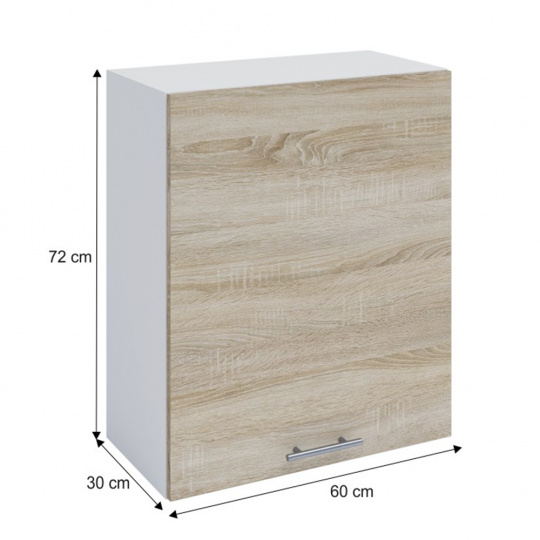horní skříňka W - 60, materiál: DTD laminovaná, barevné provedení: dub sonoma / bílá, korpus: bílá, dvířka: dub sonoma. Rozměry ŠxVxH: 60x72x30 cm. Tloušťka materiálu: 16 mm Dodáváno v demontu. Možnost zakoupení pracovní desky Fabiana Metalic brown šedá s tloušťkou 2,8 cm, šířkou 60 cm a cenou za bm 1.390 Kč. Možnost dokoupení univerzálního L / P dřezu LAY ON. Horní skříňky se nemontují na lištu, ale věší se na háčky. Háčky do zdi nejsou součástí balení, je třeba si je dokoupit.