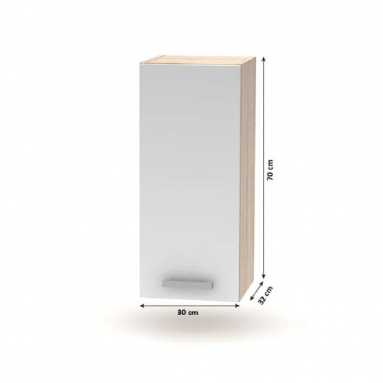 Horní skříňka 30 1DV, NOVA PLUS NOPL-002-OH Materiál: DTD laminovaná Barva: dub sonoma / bílá Rozměry (ŠxHxV): 30x32x70 cm Tloušťka materiálu: 16 mm Dodávané v demontu. Kvalitní slovenský výrobek. Cena za pracovní desku je 1.590, - Kč za bm - tloušťka 38 mm. Horní rozměr kuchyňské sestavy je 2,4 m, spodní rozměr je 1,8 m. Tloušťka materiálu: 16 mm Základní kuchyňská sestava a všechny spodní skříňky jsou dodávány bez pracovní desky, včetně dolní lišty. Možnost dokoupit univerzální L / P dřez LAY ON.