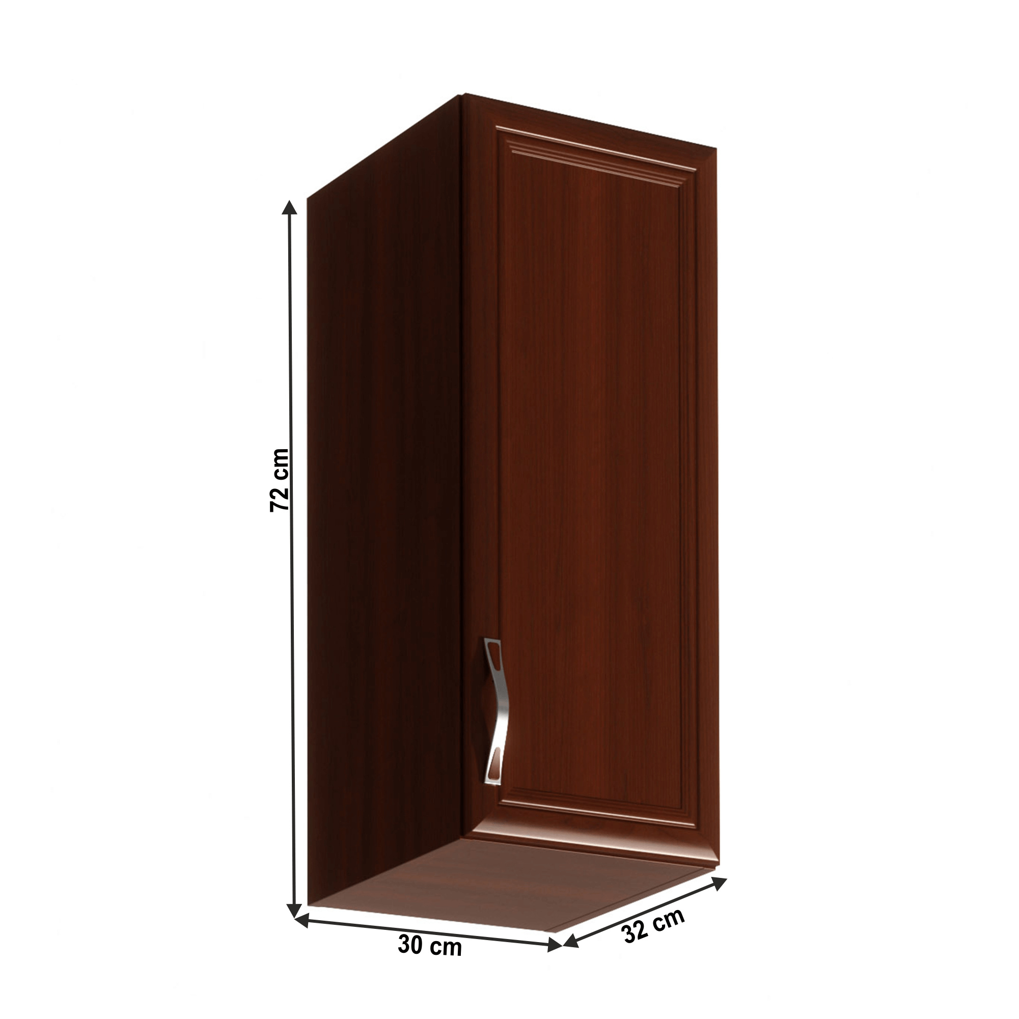 Horní skříňka G30 pravá ke kuchyni SICILIA Provedení: DTD laminovaná / lišty MDF Barva: ořech Milano Rozměry (ŠxHxV): 30x32x72 cm Tloušťka materiálu: 15 mm Spodní skříňky jsou dodávány bez pracovní desky. Můžete si objednat pracovní desku royal beigemarble k provedení ořech Milano - tloušťka 28mm za 1.590 Kč/bm a nebo pracovní desku dub Lancelot k provedení sosna andersen - tloušťka 38 mm za 1.690 Kč/bm.